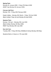 Spring Term: Mon 5 Jan 2026 – Fri 27 Mar 2026