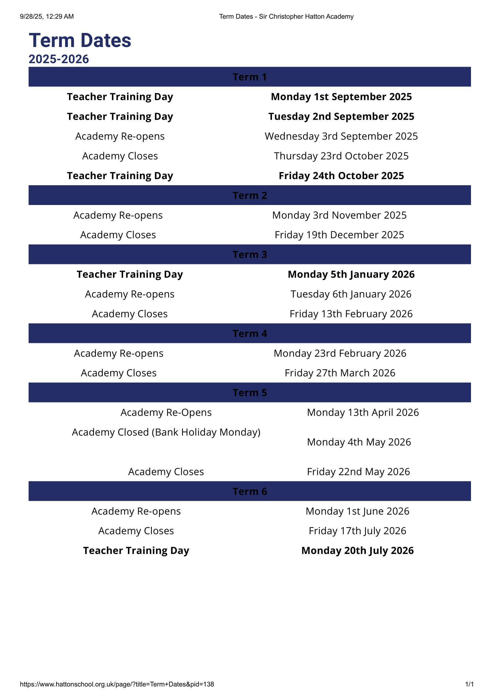 Sir Christopher Hatton Academy Term dates (2025-2026)