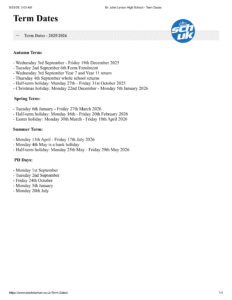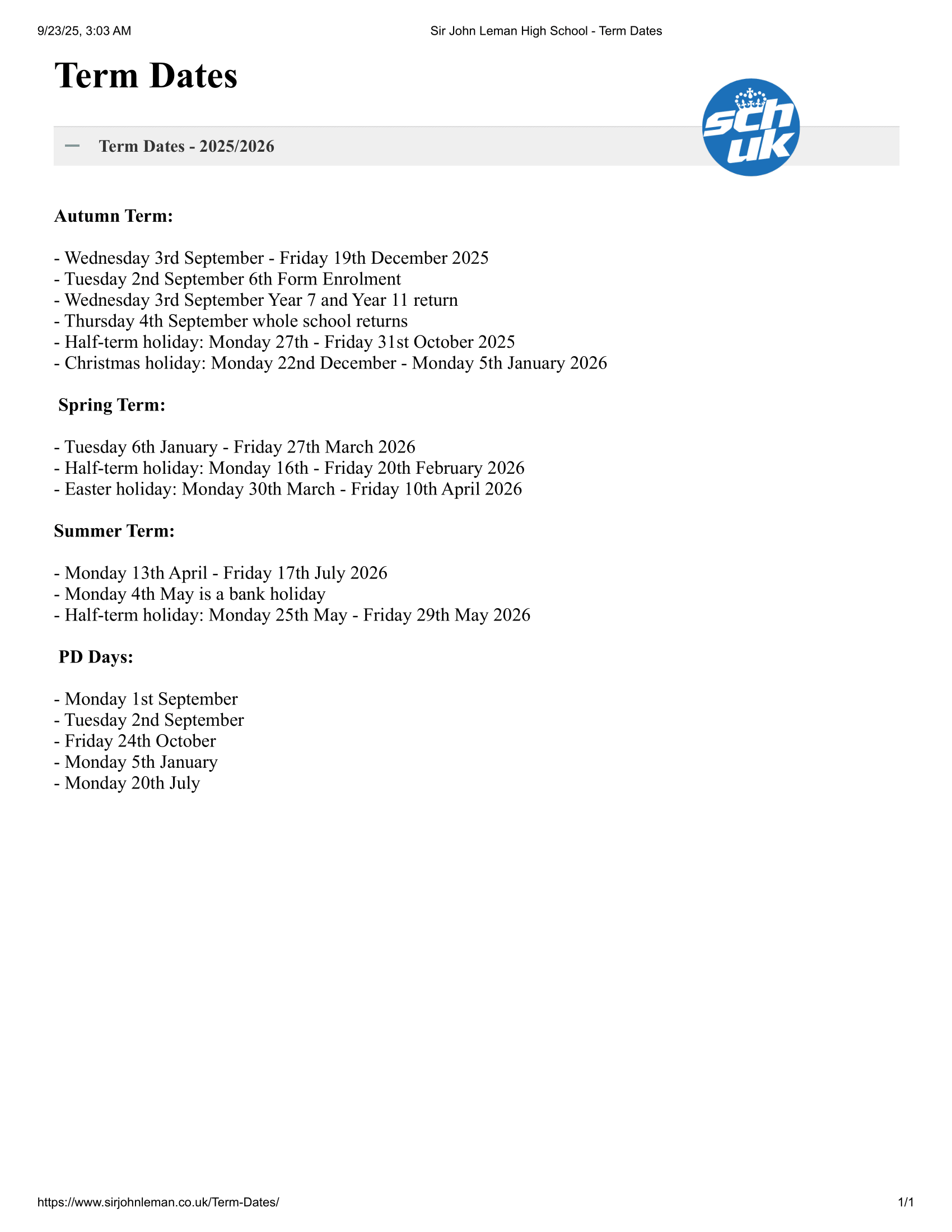 Sir John Leman High School Term dates (2025-2026)