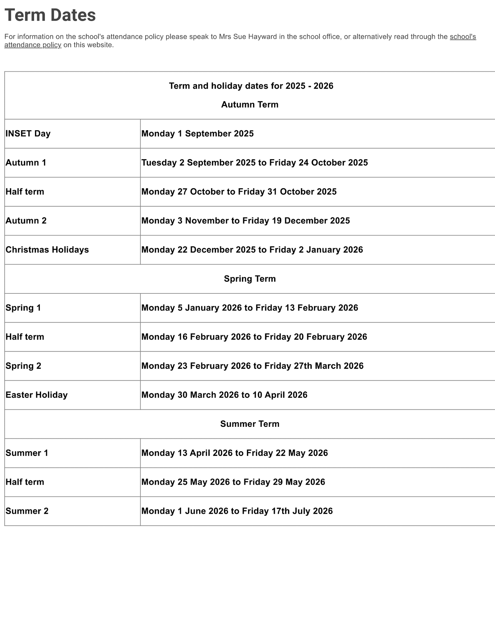Please read: These dates are taken from the school’s published calendar for 2025–2026. Items reflect the legend categories (term dates, half terms, holidays, bank holidays, and inset days) exactly as shown on the calendar.