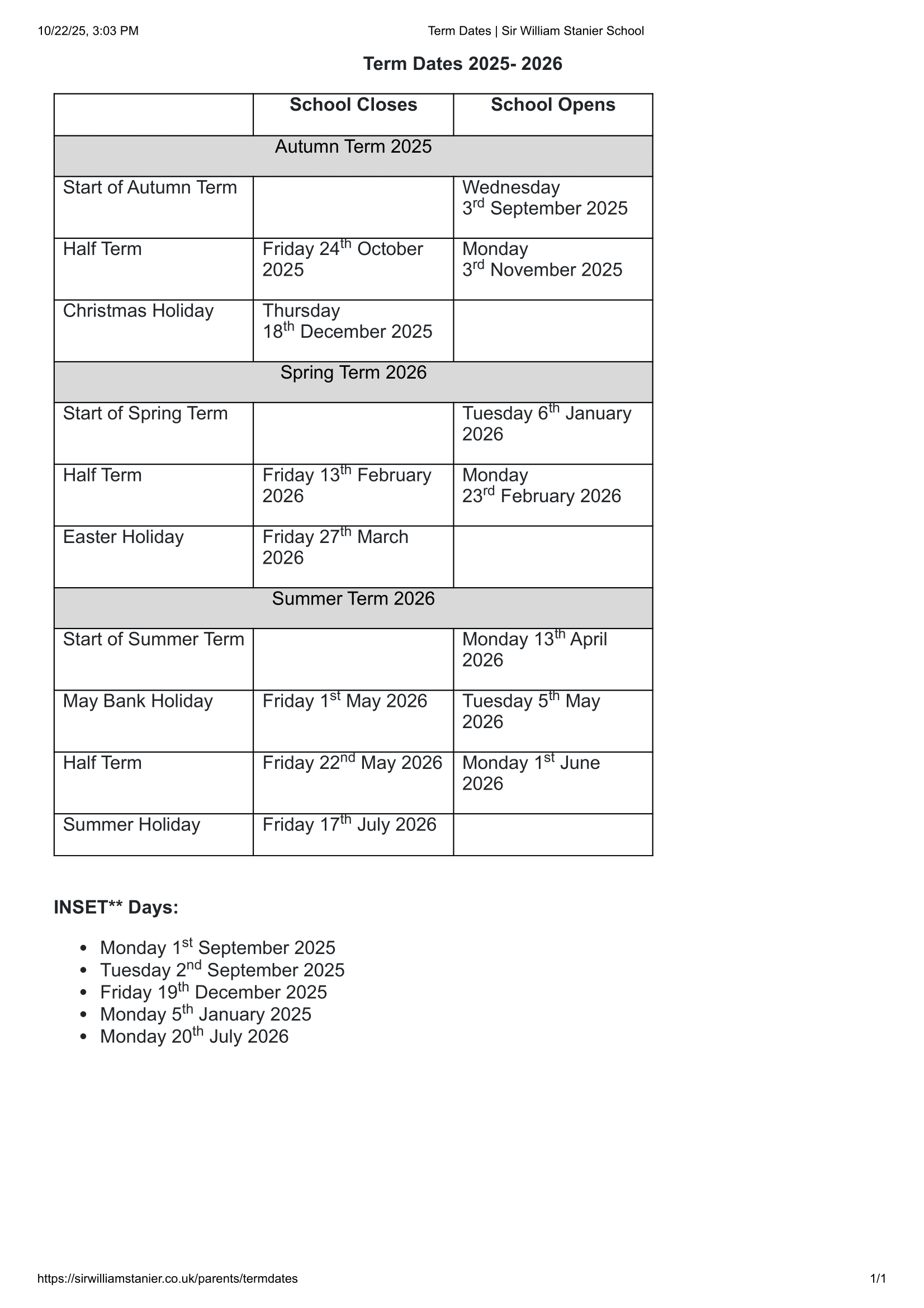 Sir William Stanier School Term Dates 2025-2026