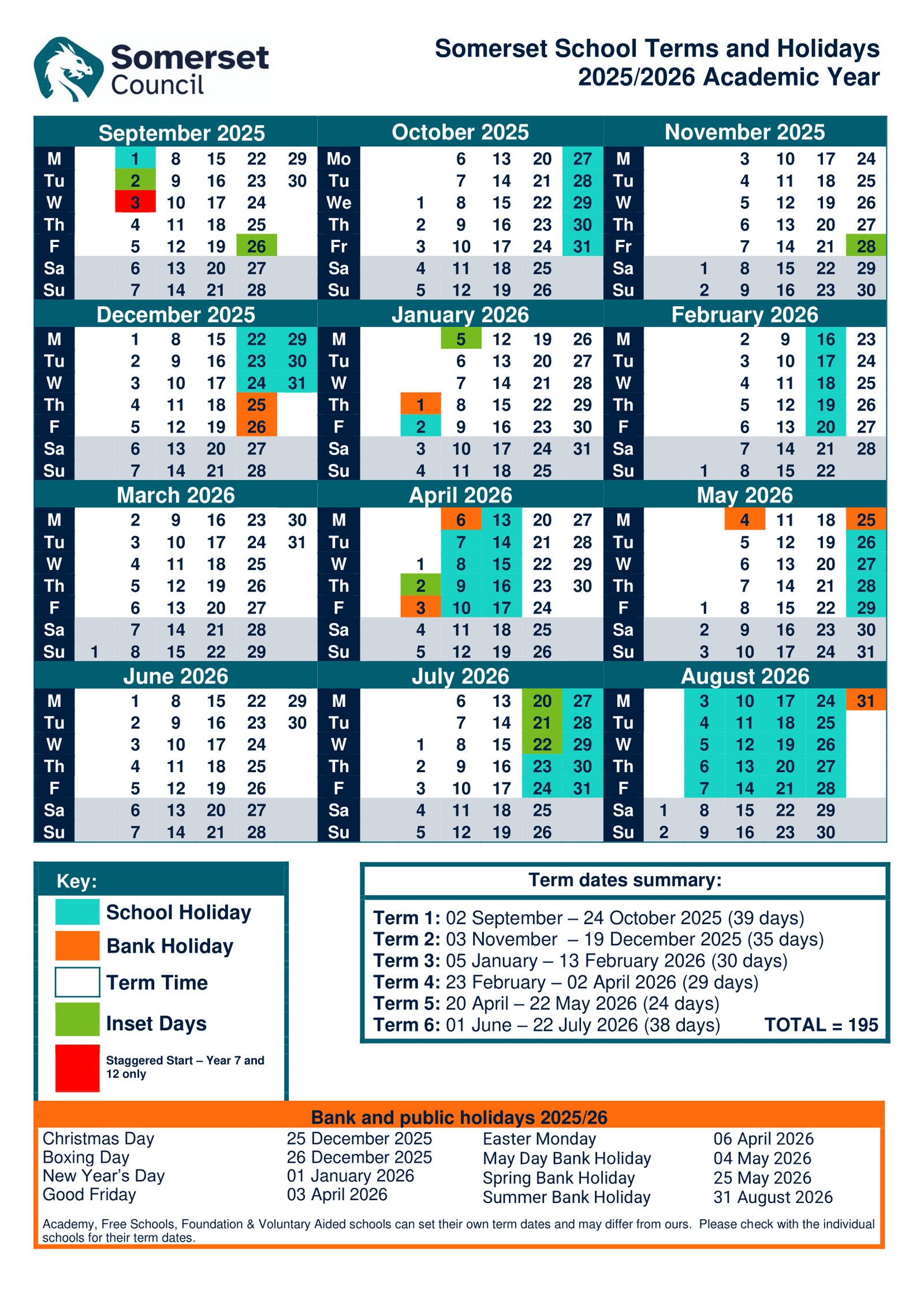 Somerset Council Schools Term dates (2025-2026)