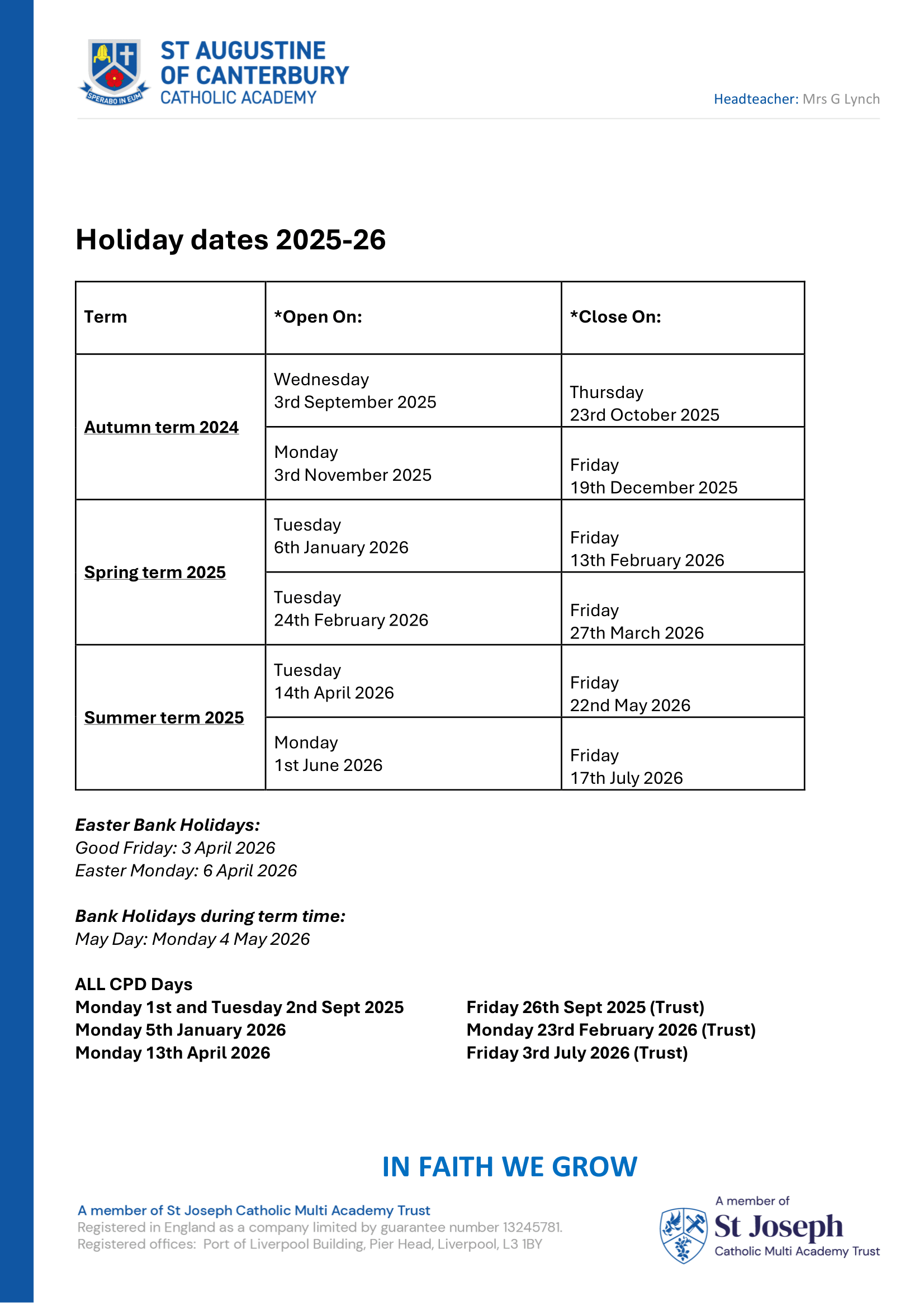 St Augustine of Canterbury Catholic Academy Term dates (2025-2026)