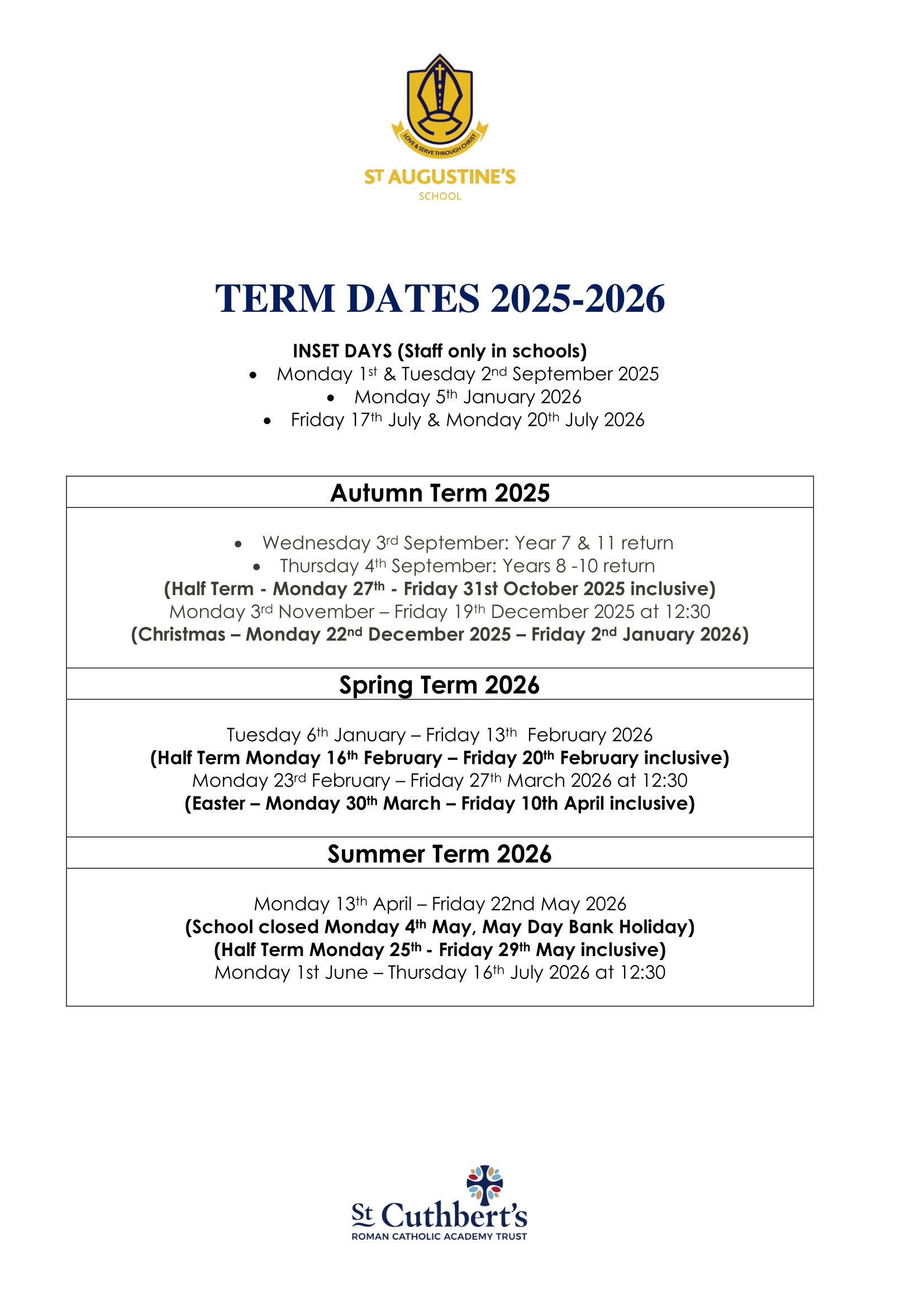 The school Term Dates shown on this page has been sourced directly from the official St Augustine’s School north yorkshire term dates website. Please be aware that all dates and events may be amended at the discretion of the school or local council. For the most up-to-date and accurate information, we recommend checking the official council website or contacting the school office.