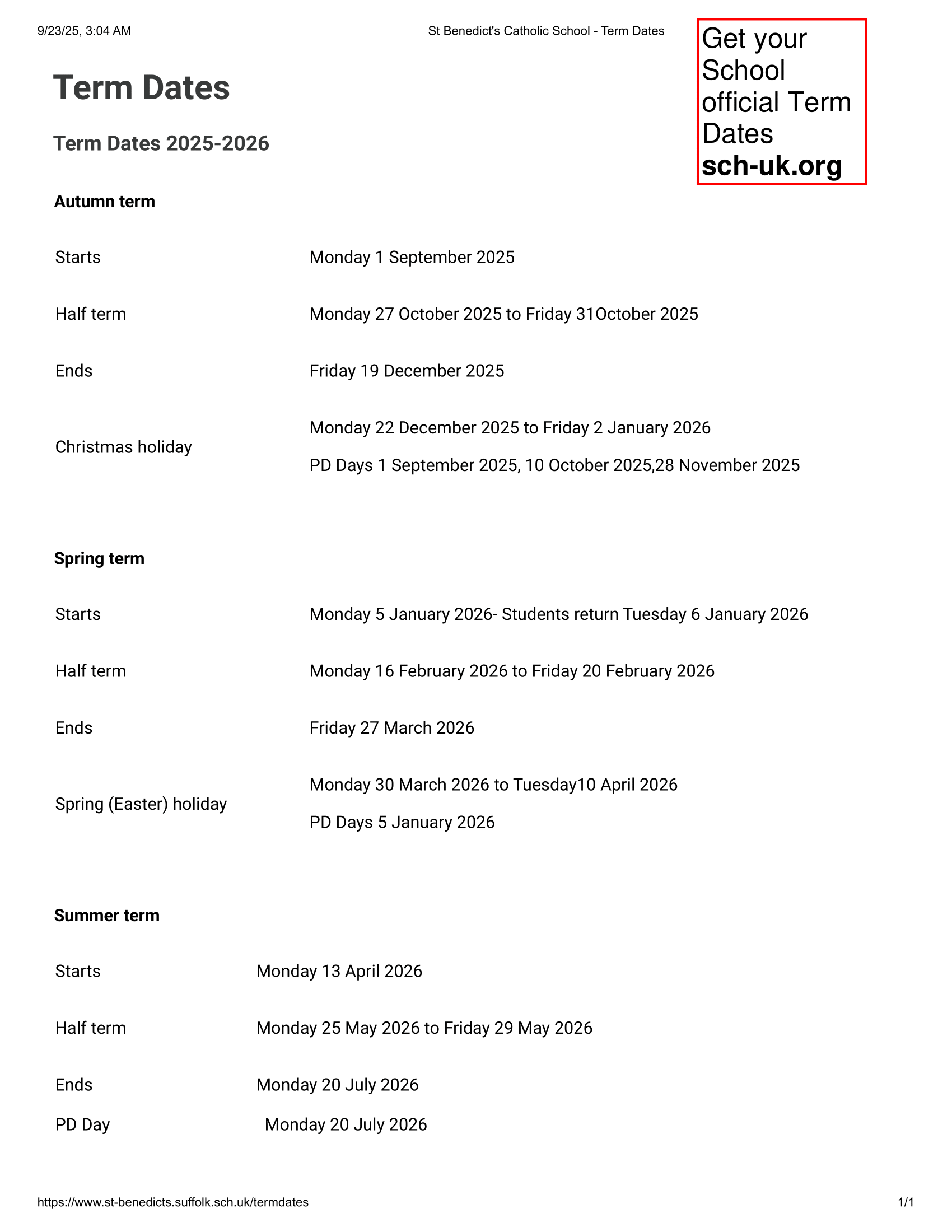 The school Term Dates shown on this page has been sourced directly from the official St Benedict's Catholic School term dates website. Please be aware that all dates and events may be amended at the discretion of the school or local council. For the most up-to-date and accurate information, we recommend checking the official council website or contacting the school office.