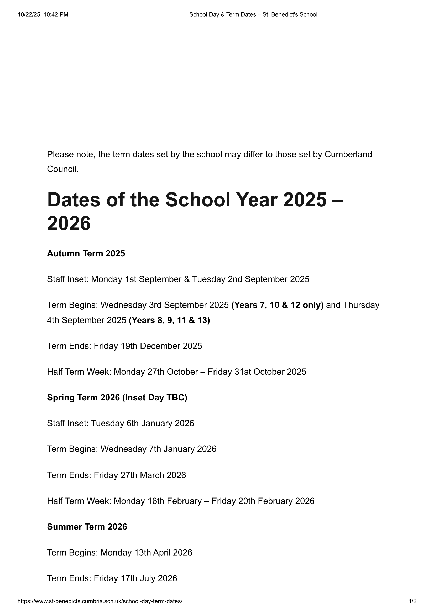 The school Term Dates shown on this page has been sourced directly from the official St. Benedict’s School Term Dates 25-26 Official Update website. Please be aware that all dates and events may be amended at the discretion of the school or local council. For the most up-to-date and accurate information, we recommend checking the official council website or contacting the school office.