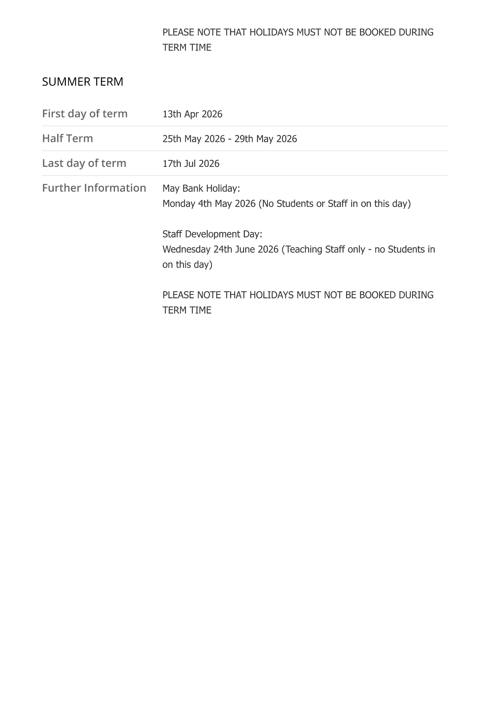 Calendar note: “PLEASE NOTE THAT HOLIDAYS MUST NOT BE BOOKED DURING TERM TIME.”