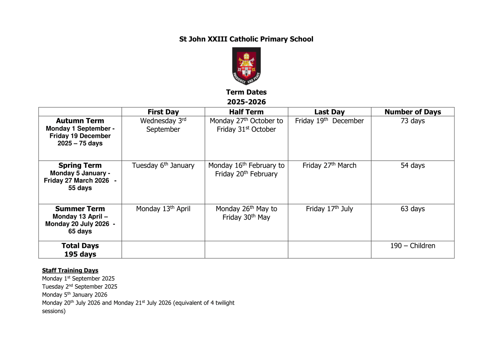 The school Term Dates shown on this page has been sourced directly from the official St John XXIII Catholic Primary School Term Dates 25-26 Updated website. Please be aware that all dates and events may be amended at the discretion of the school or local council. For the most up-to-date and accurate information, we recommend checking the official council website or contacting the school office.