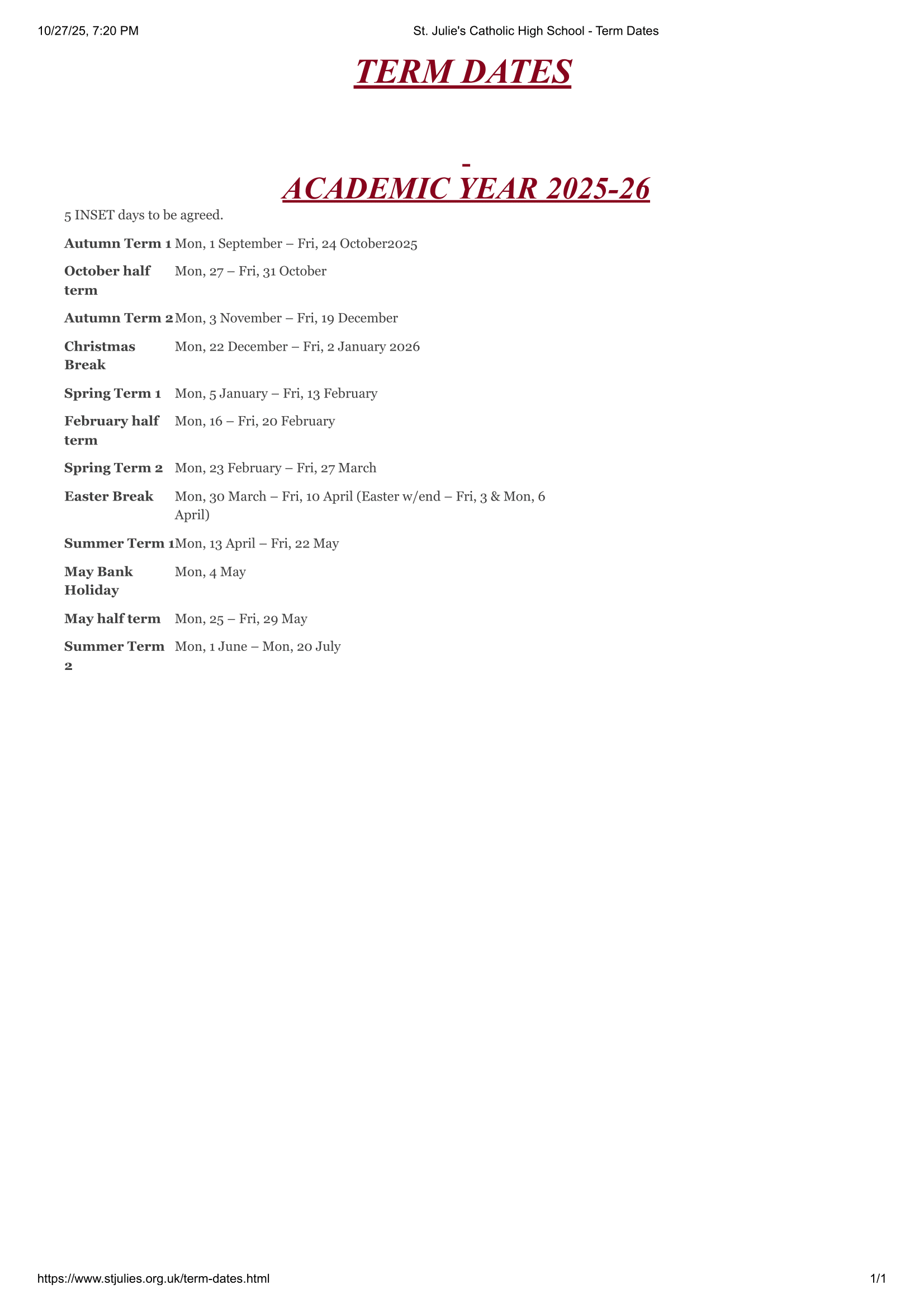 • Monday 1st September 2025 – Staff INSET Day