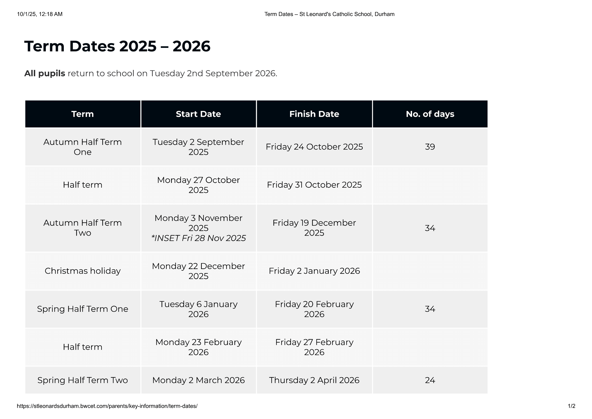 St Leonard's Catholic School, Durham Term dates (2025-2026)