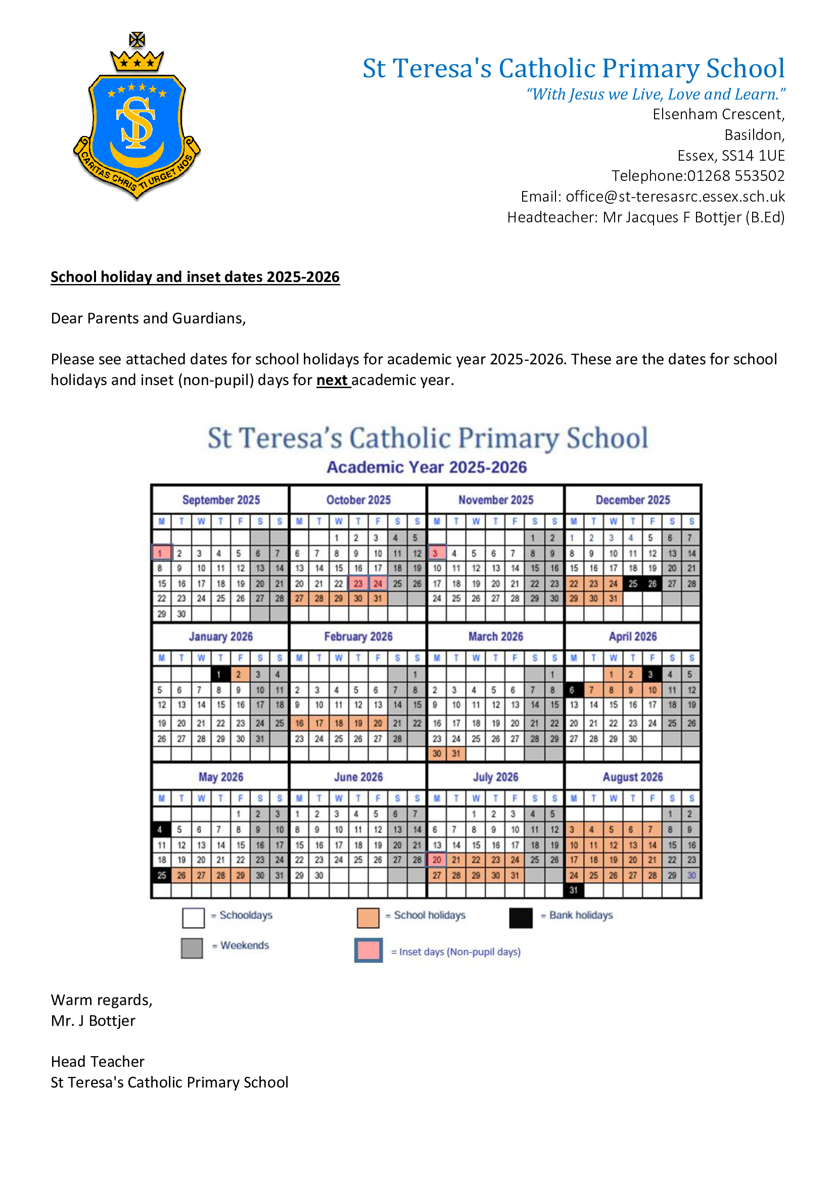 St Teresa's Catholic Primary School Term dates (2025-2026)
