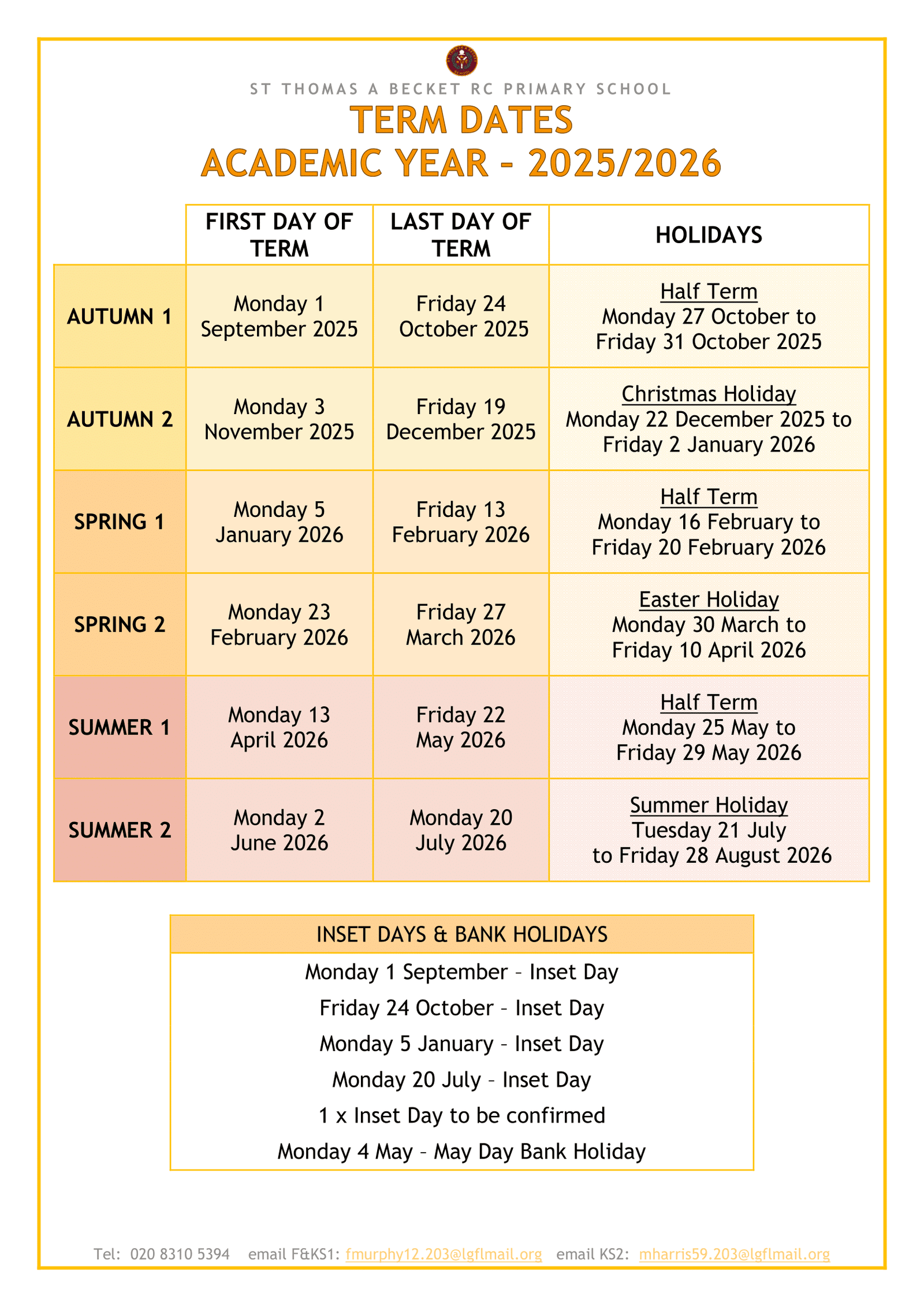 St Thomas a Becket RC Primary School Term Dates 2025–2026