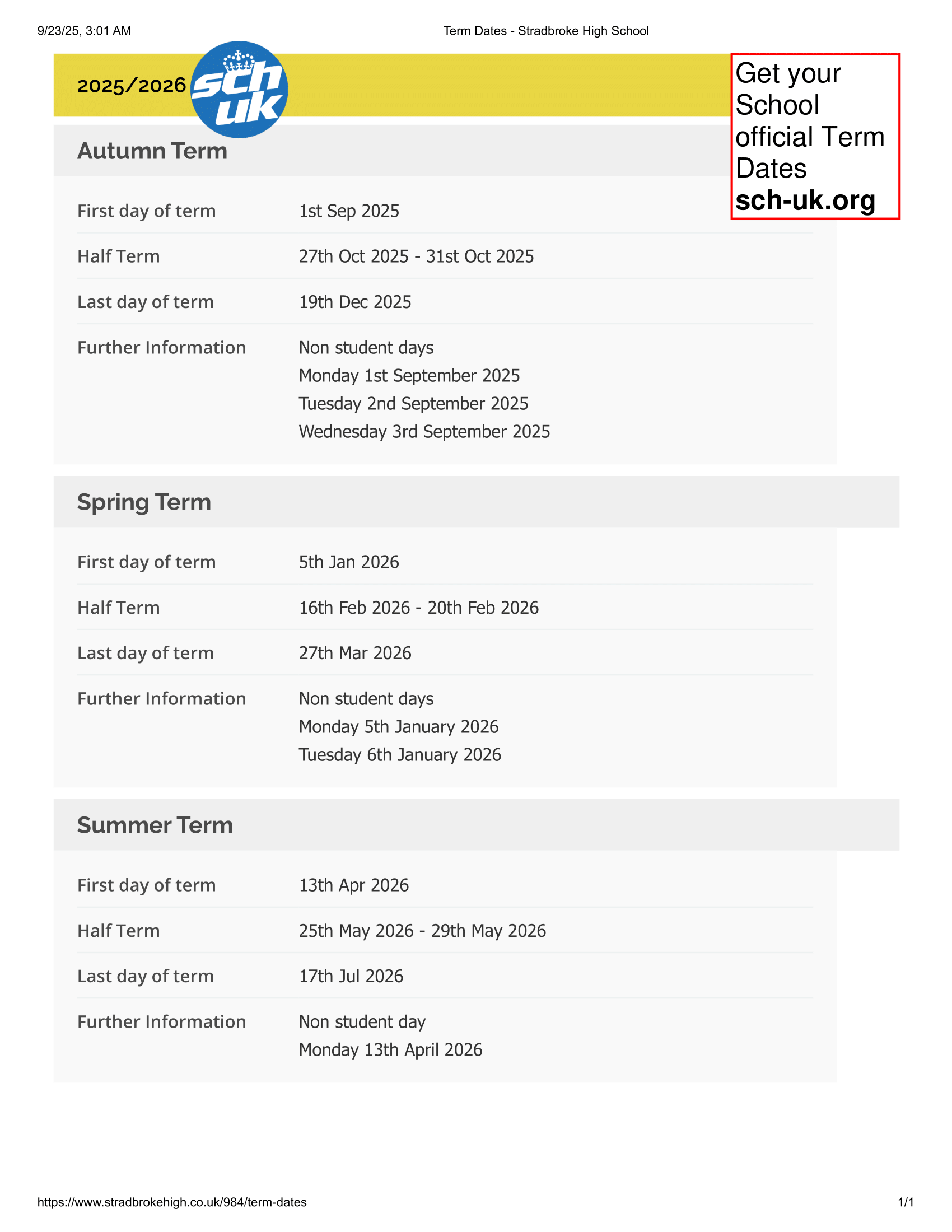 The school Term Dates shown on this page has been sourced directly from the official Stradbroke High School term dates website. Please be aware that all dates and events may be amended at the discretion of the school or local council. For the most up-to-date and accurate information, we recommend checking the official council website or contacting the school office.
