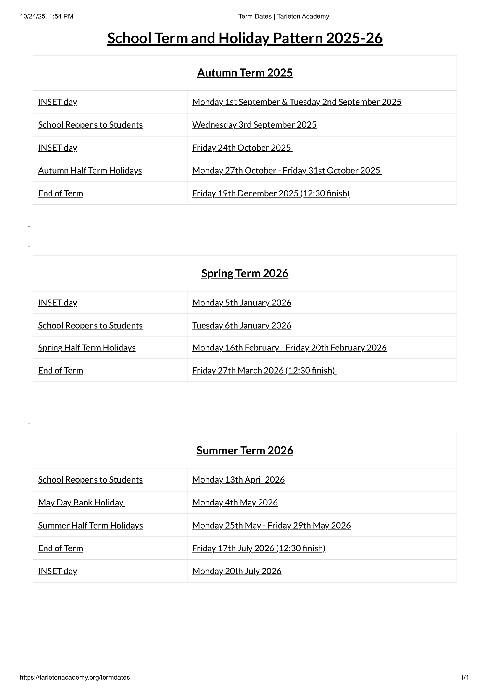 The school Term Dates shown on this page has been sourced directly from the official Tarleton Academy website. Please be aware that all dates and events may be amended at the discretion of the school or local council. For the most up-to-date and accurate information, we recommend checking the official council website or contacting the school office.
