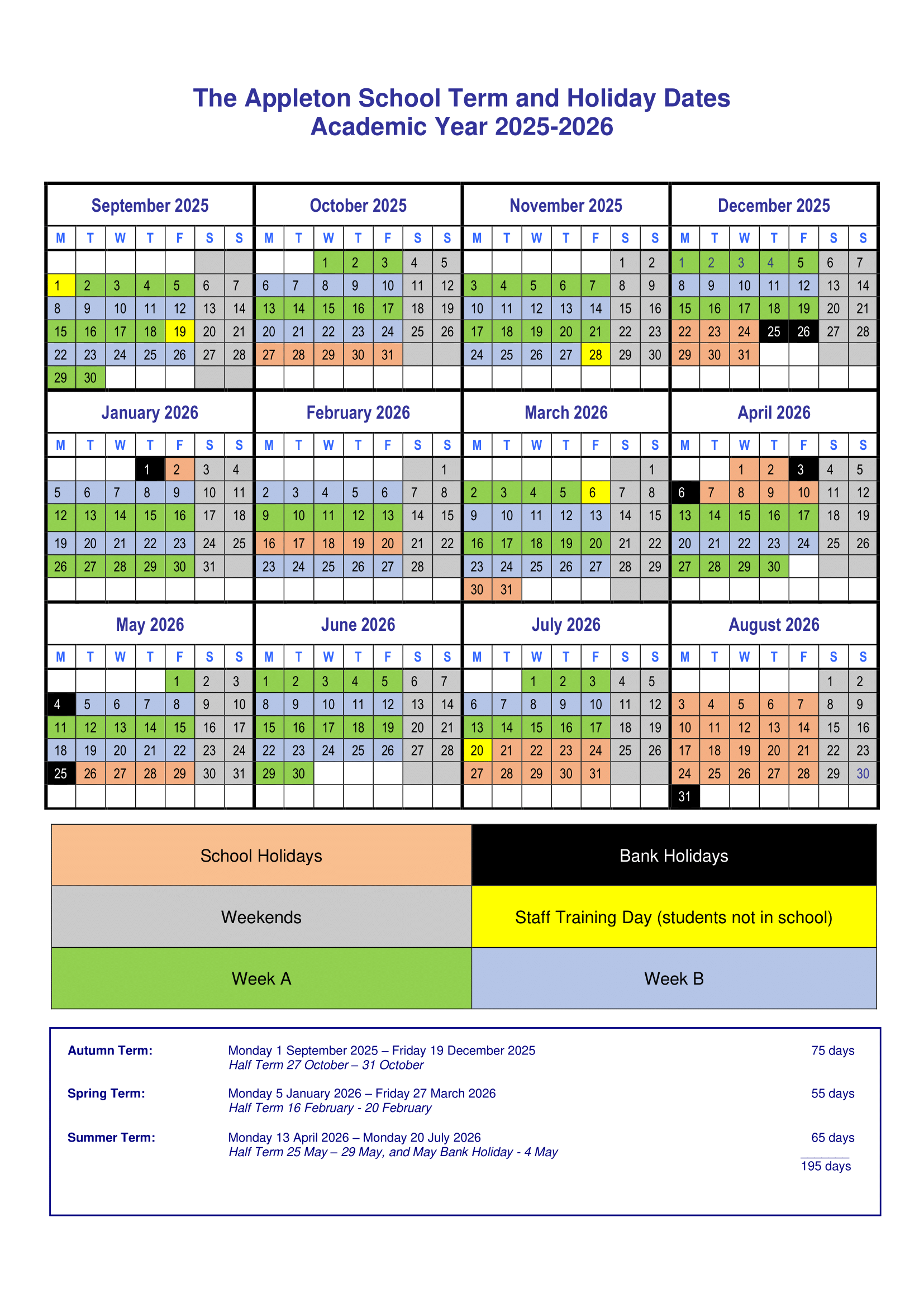 The Appleton School — Term Dates 2025–2026 (FAQ)