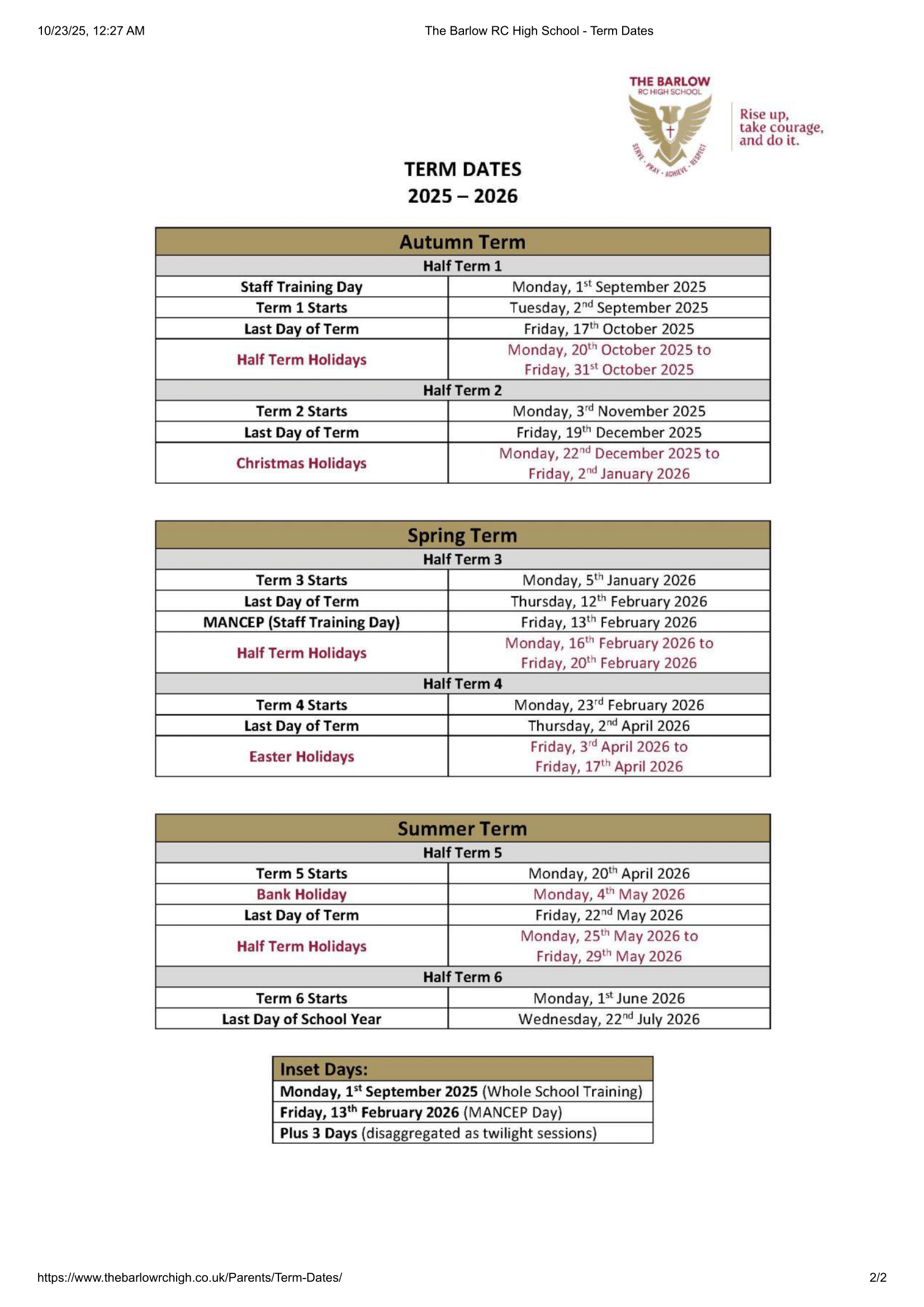The school Term Dates shown on this page has been sourced directly from the official The Barlow RC High School Term Dates 25-26 Official Update website. Please be aware that all dates and events may be amended at the discretion of the school or local council. For the most up-to-date and accurate information, we recommend checking the official council website or contacting the school office.