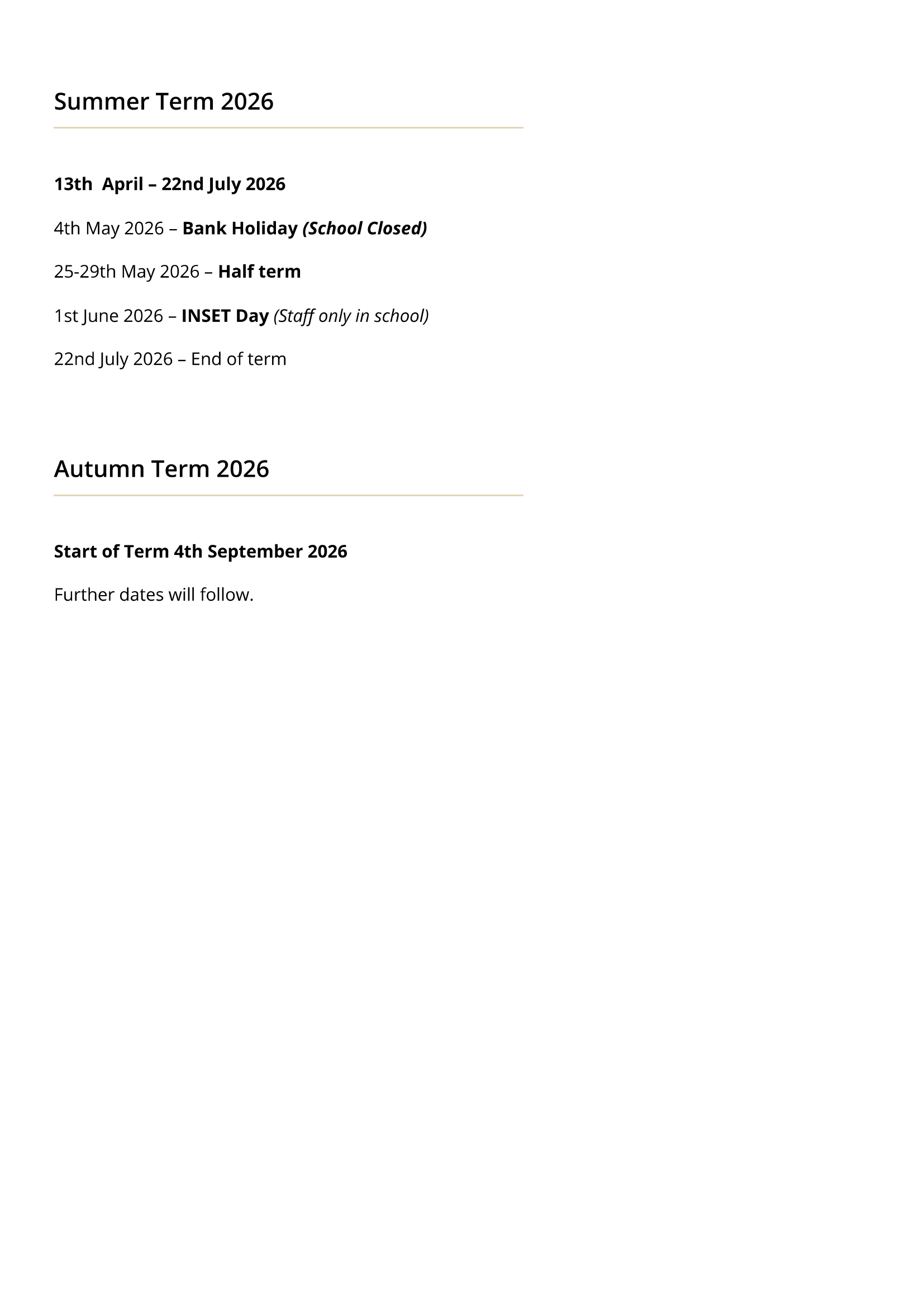 • 3 September 2025 – INSET Day (Staff only in school) INSET