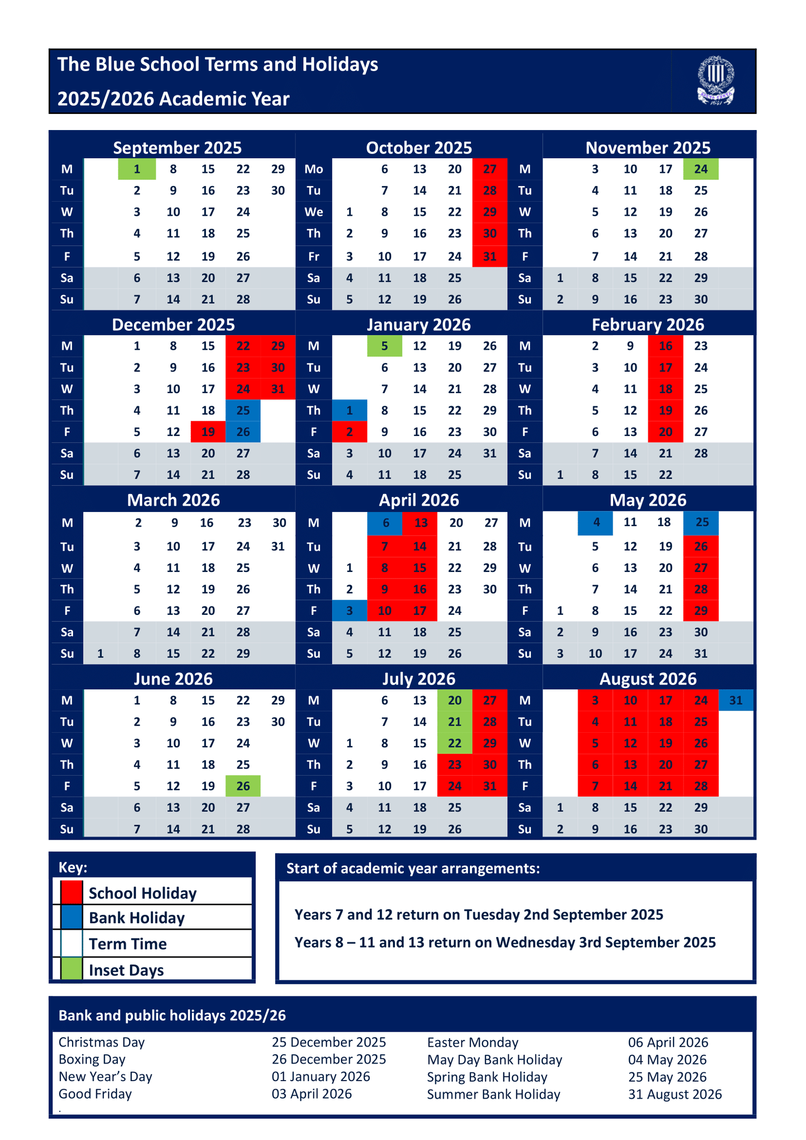 The Autumn Term 2025 at The Blue School starts on Tuesday 2nd September 2025 and ends on Friday 19th December 2025.