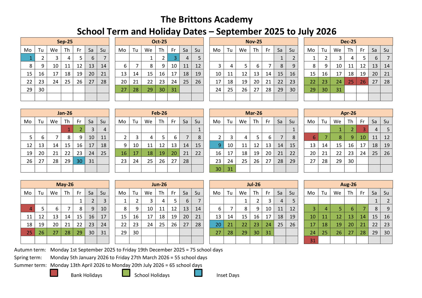 The Brittons Academy Term dates (2025-2026)
