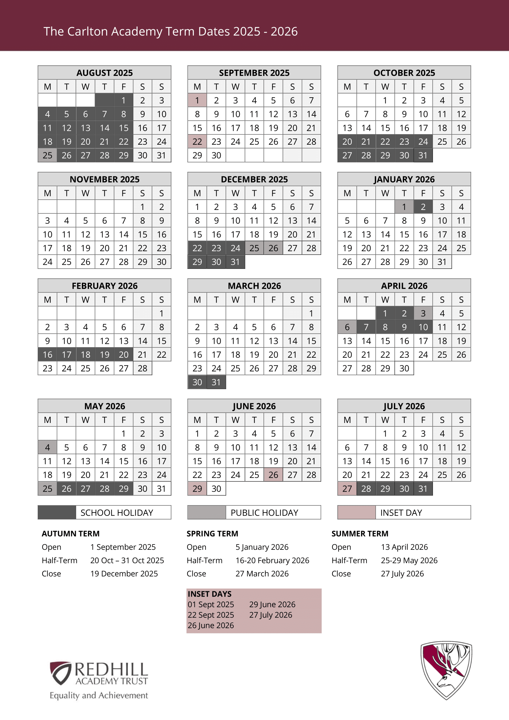 The school Term Dates shown on this page has been sourced directly from the official The Carlton Academy Term Dates 25-26 Official website. Please be aware that all dates and events may be amended at the discretion of the school or local council. For the most up-to-date and accurate information, we recommend checking the official council website or contacting the school office.