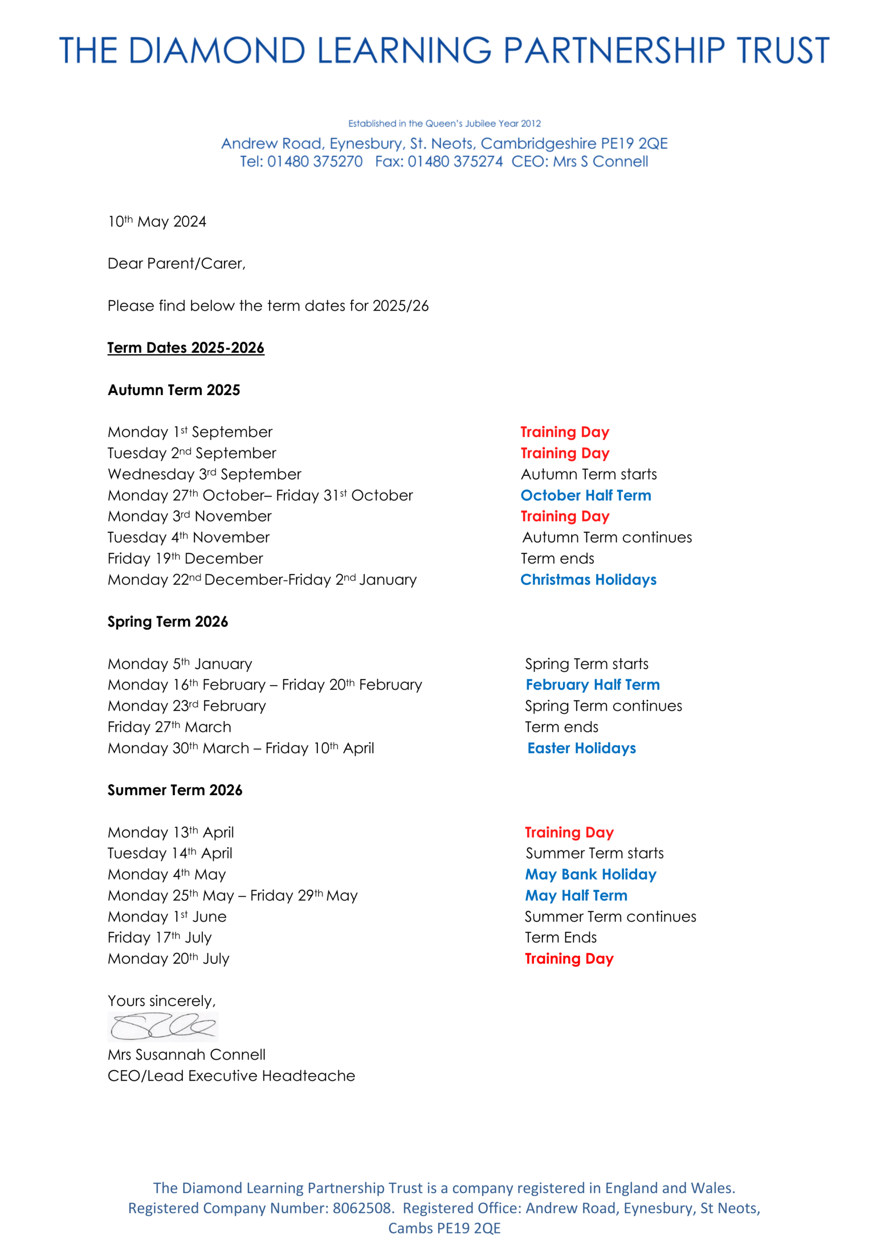 The Diamond Learning Partnership Trust Term dates (2025-2026)