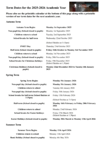 Please read: These dates are taken from the school’s published calendar for 2025–2026. Items reflect the legend categories (term dates, half terms, holidays, bank holidays, and inset days) exactly as shown on the calendar.