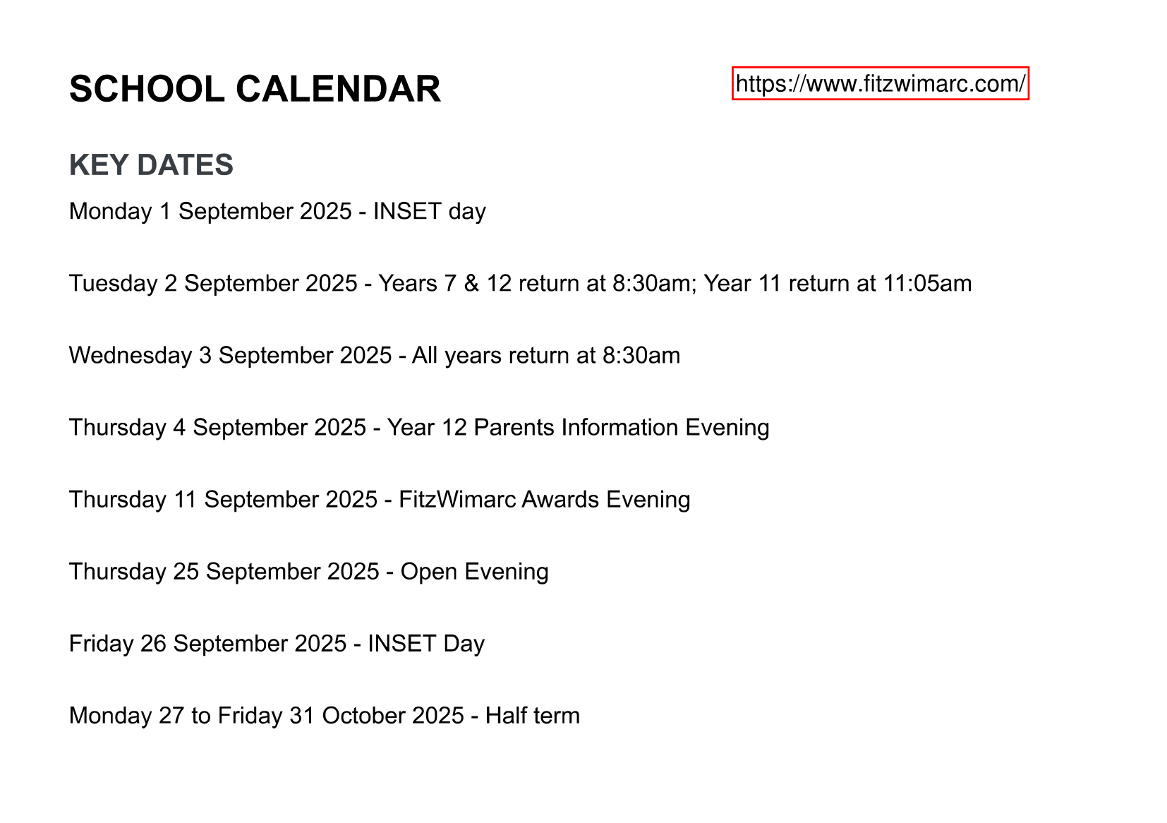 The school Term Dates shown on this page has been sourced directly from the official The FitzWimarc School term dates website. Please be aware that all dates and events may be amended at the discretion of the school or local council. For the most up-to-date and accurate information, we recommend checking the official council website or contacting the school office.