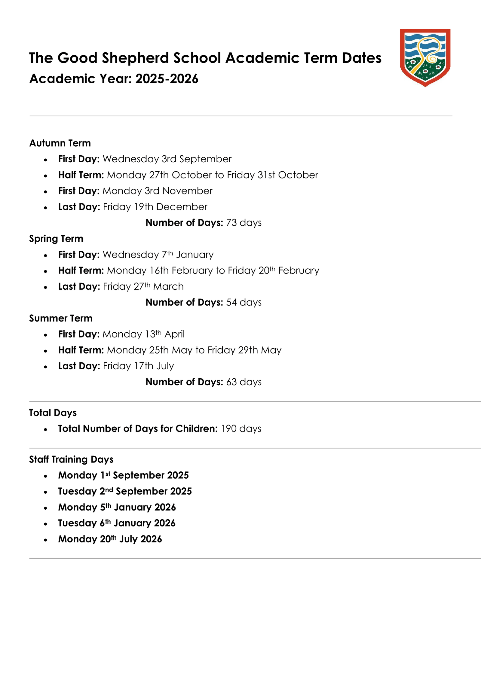 The Good Shepherd School Term Dates – Academic Year 2025–2026