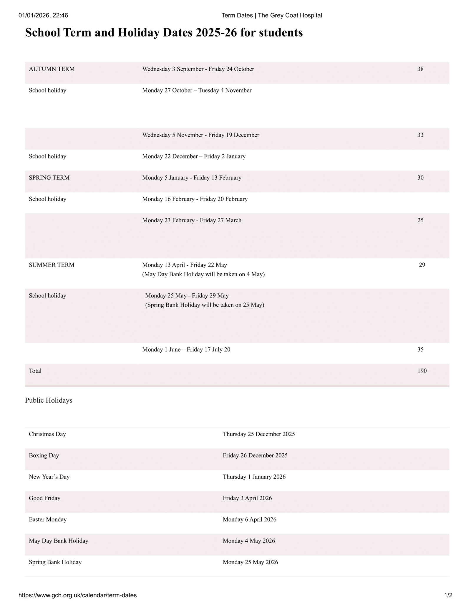 Public and bank holidays during the 2025–2026 school year include Christmas Day (25 December 2025), Boxing Day (26 December 2025), New Year’s Day (1 January 2026), Good Friday (3 April 2026), Easter Monday (6 April 2026), Early May Bank Holiday (4 May 2026), Spring Bank Holiday (25 May 2026), and Summer Bank Holiday (31 August 2026).