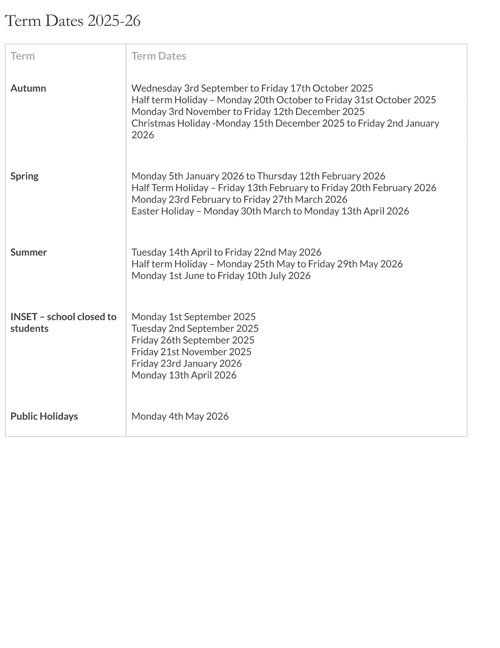 Are there any INSET days when the school is closed to students?