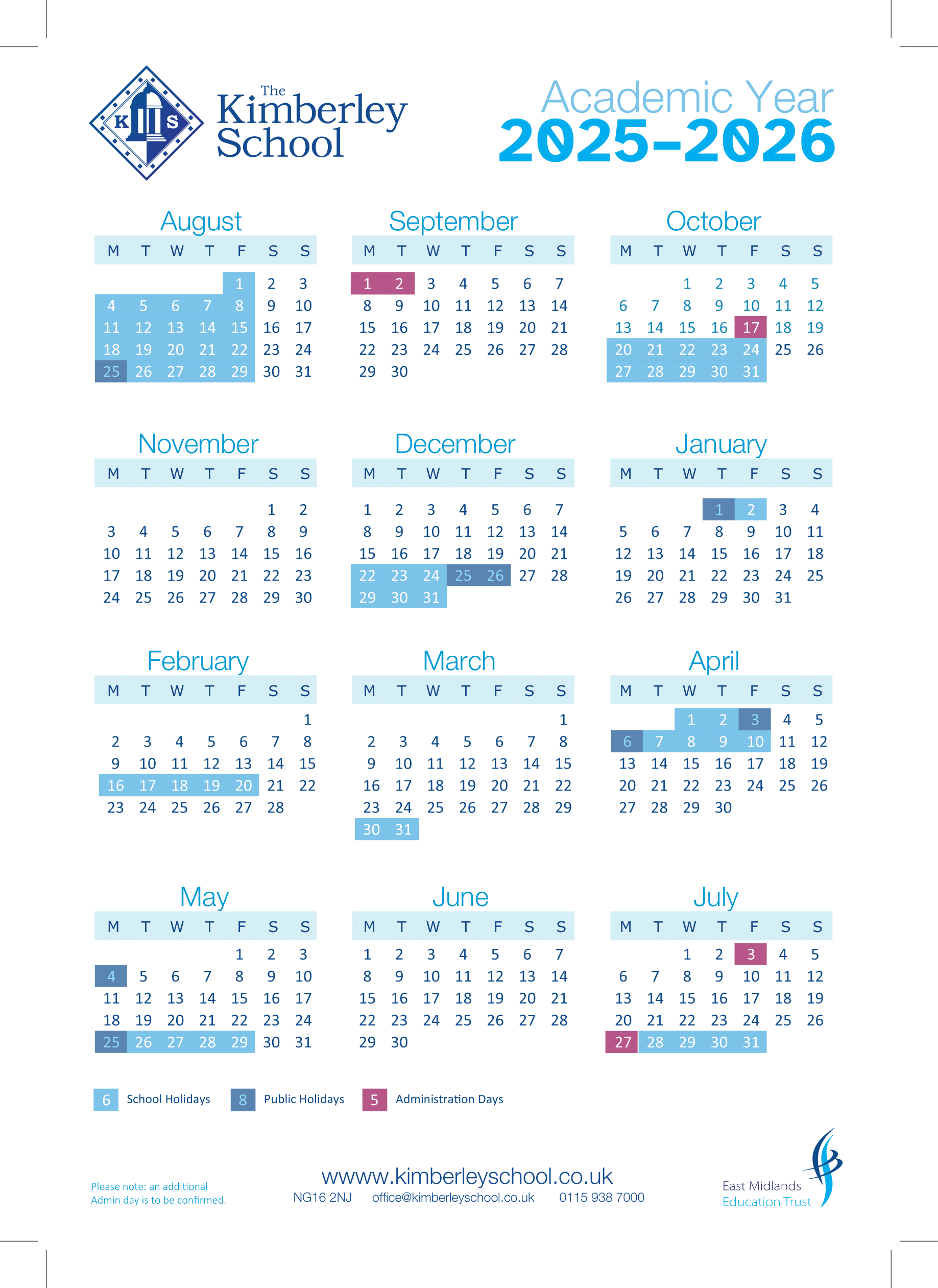 The calendar also notes: “Please note: an additional Admin day is to be confirmed.”