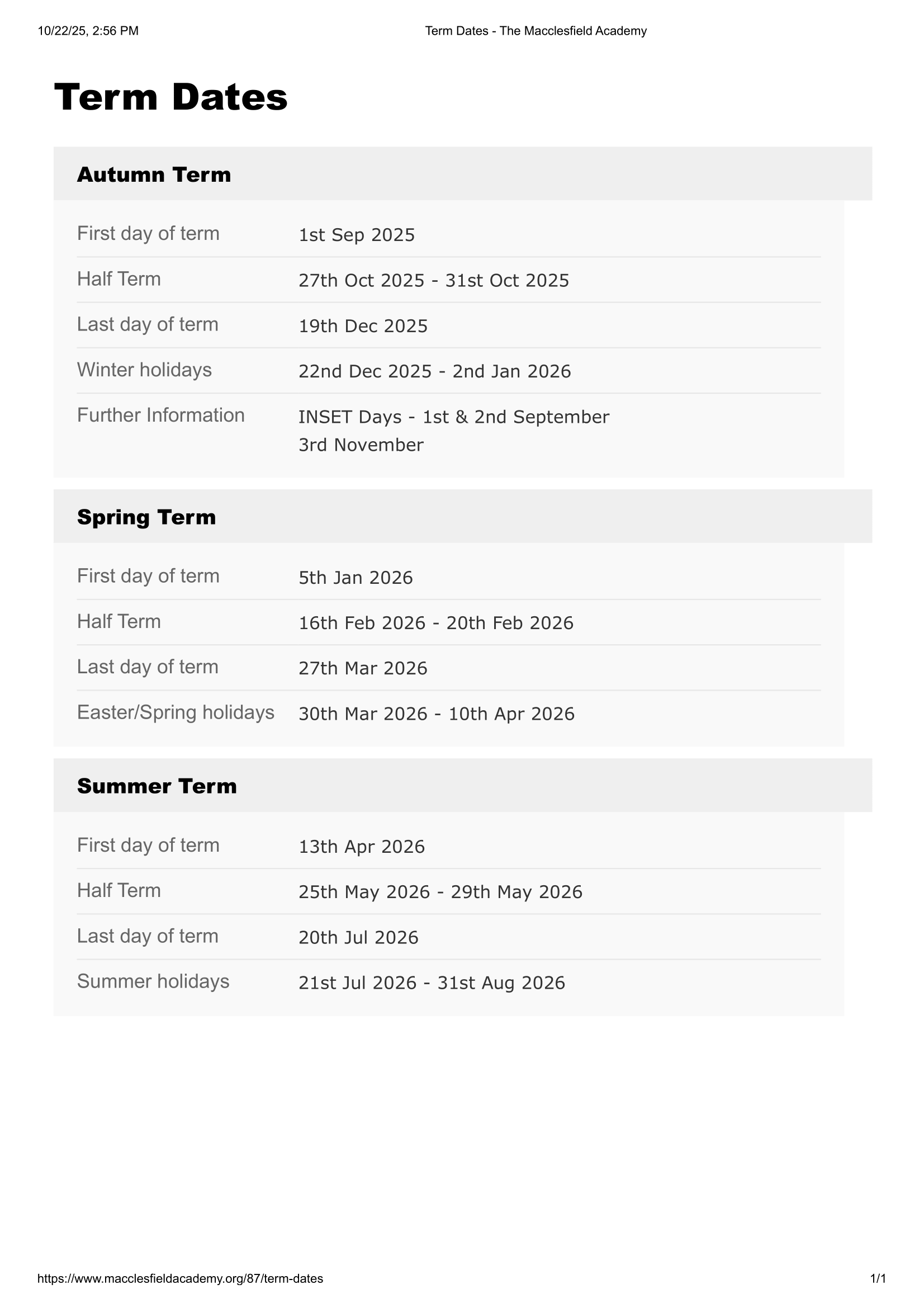 The school Term Dates shown on this page has been sourced directly from the official The Macclesfield Academy Term Dates 25-26 Official Update website. Please be aware that all dates and events may be amended at the discretion of the school or local council. For the most up-to-date and accurate information, we recommend checking the official council website or contacting the school office.