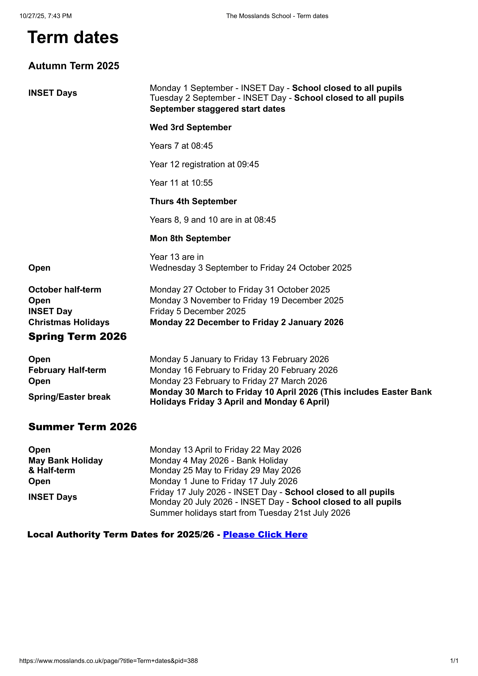 The school Term Dates shown on this page has been sourced directly from the official The Mosslands School Term Dates 25-26 Official Updates website. Please be aware that all dates and events may be amended at the discretion of the school or local council. For the most up-to-date and accurate information, we recommend checking the official council website or contacting the school office.