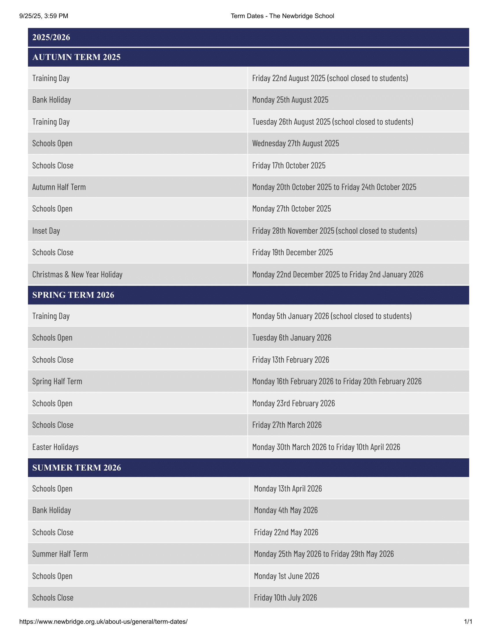 The Newbridge School – Term Dates FAQ (Academic Year 2025/2026)