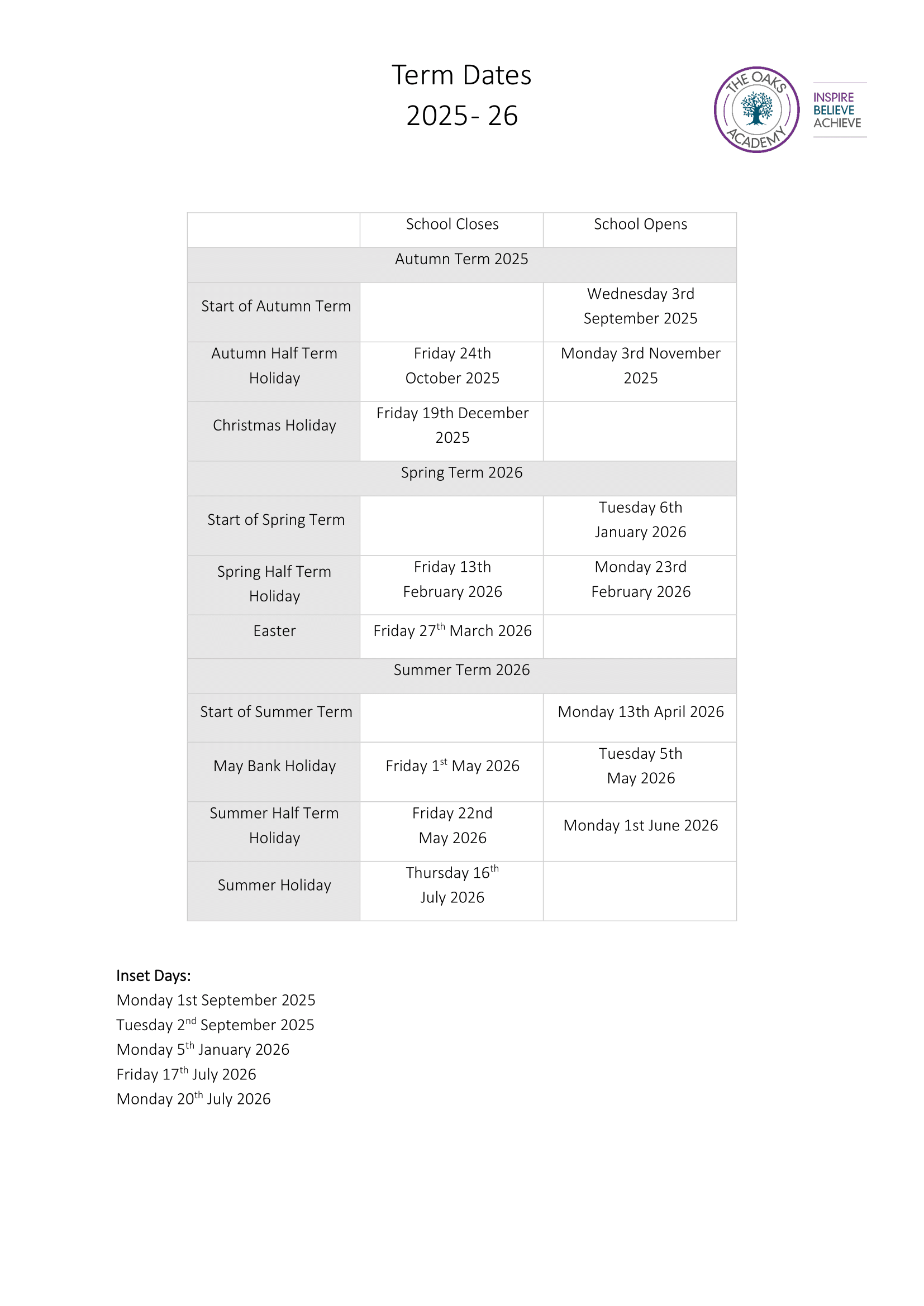 The Autumn Term at The Oaks Academy starts on Wednesday 3rd September 2025 and ends on Friday 19th December 2025.