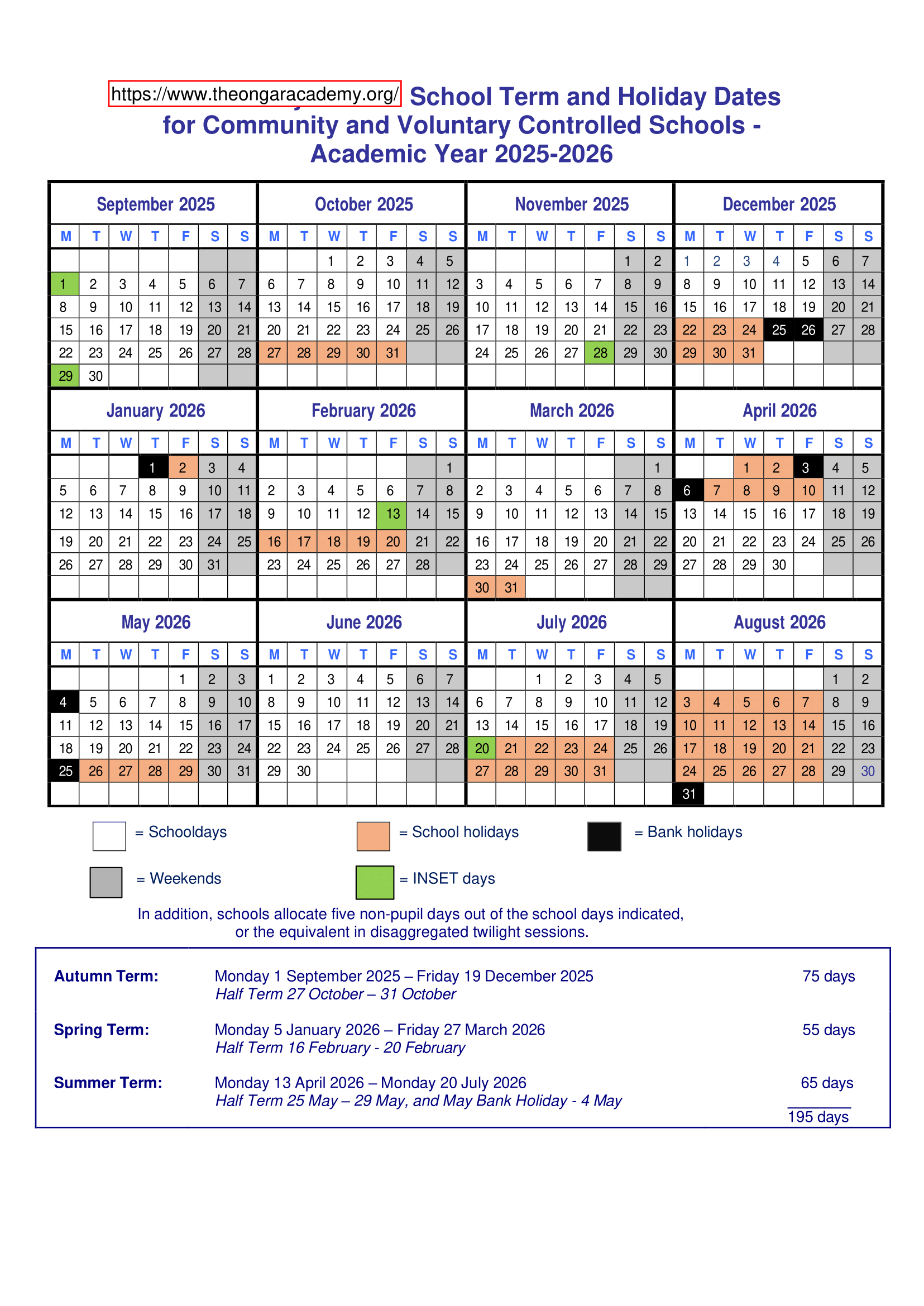 School: The Ongar Academy Year: 2025–2026 Source calendar: Essex CC pattern (with INSET allocation noted)