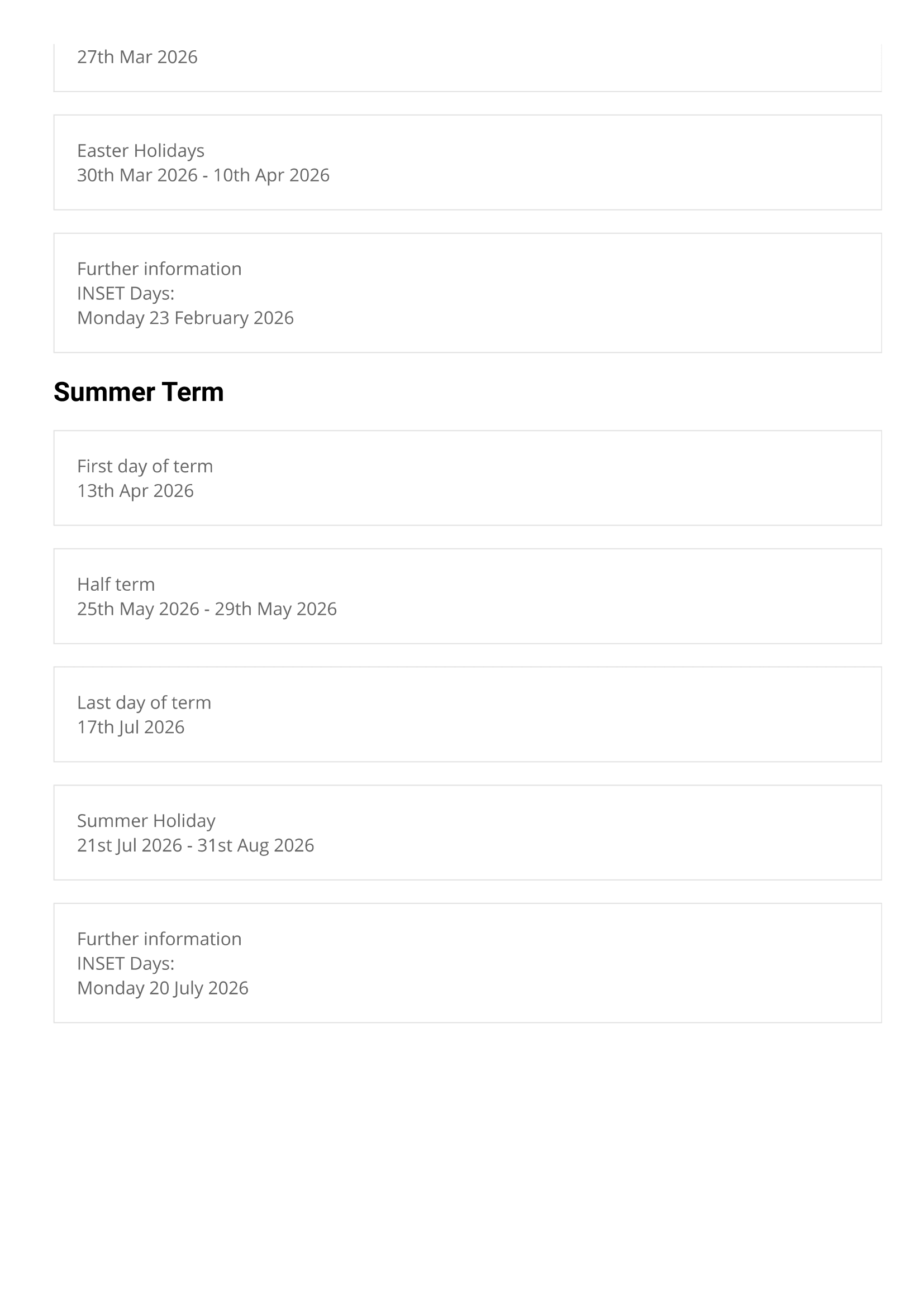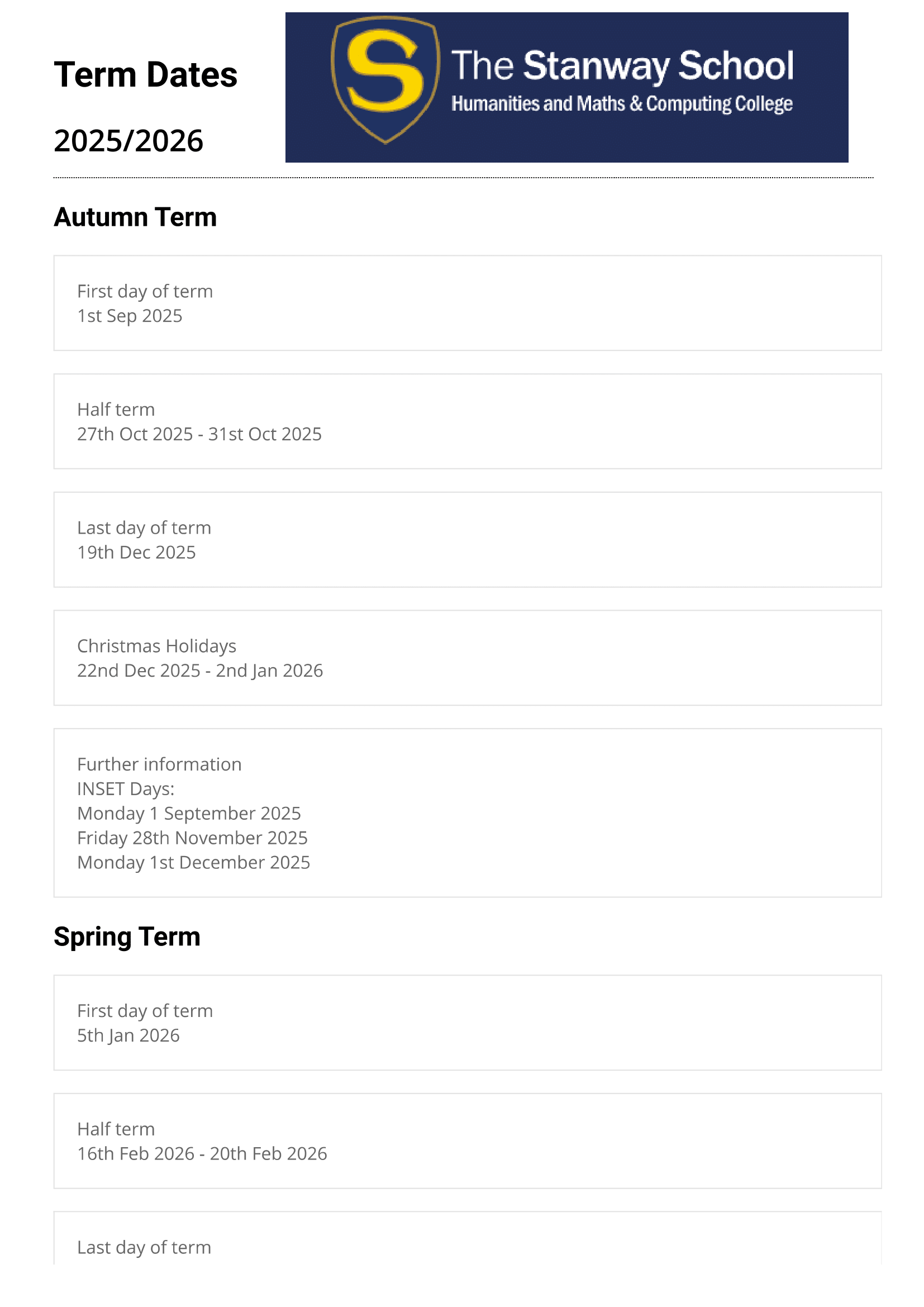 The Stanway School Term dates (2024-2025)