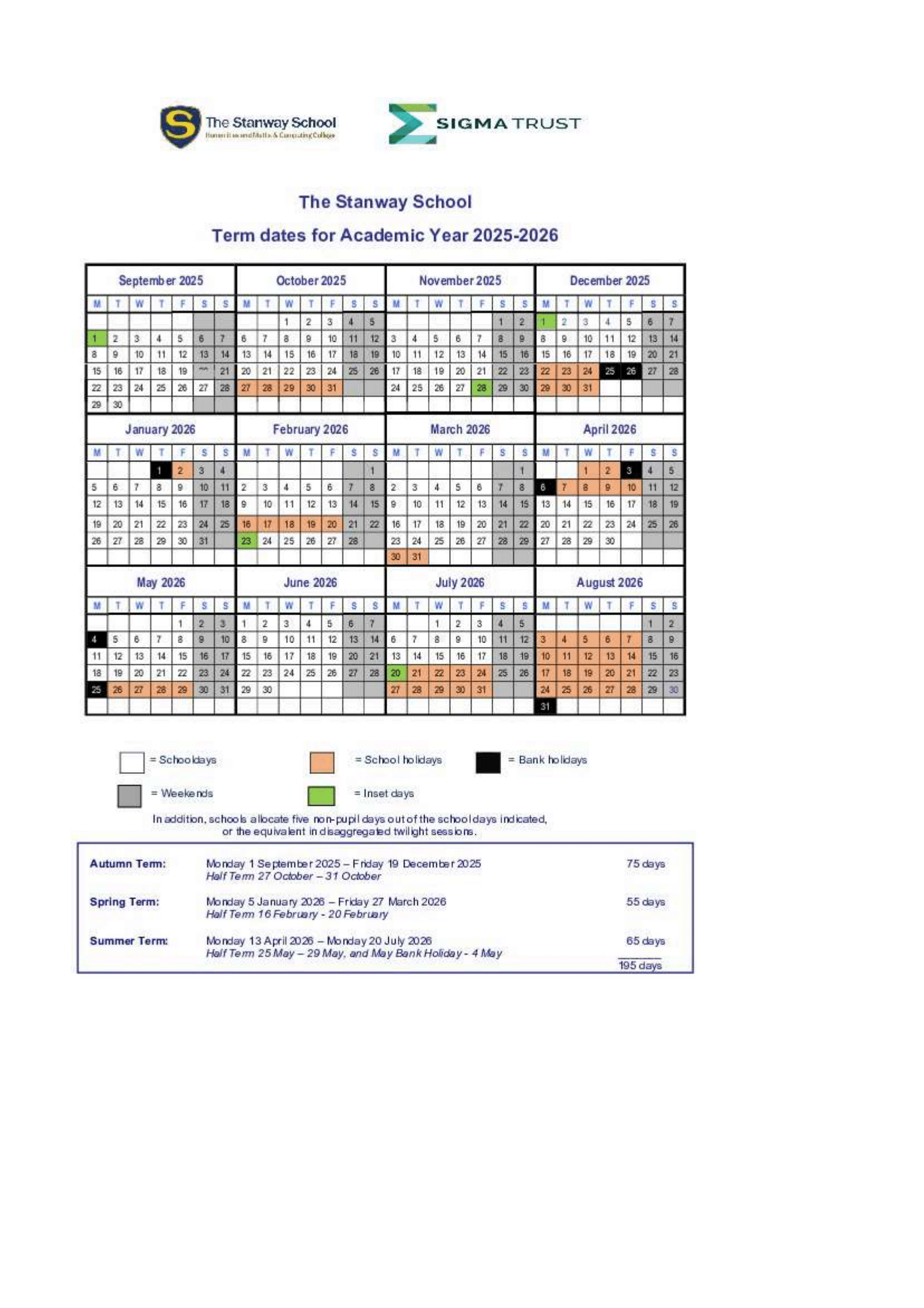 These dates reflect the calendar highlights for The Stanway School.