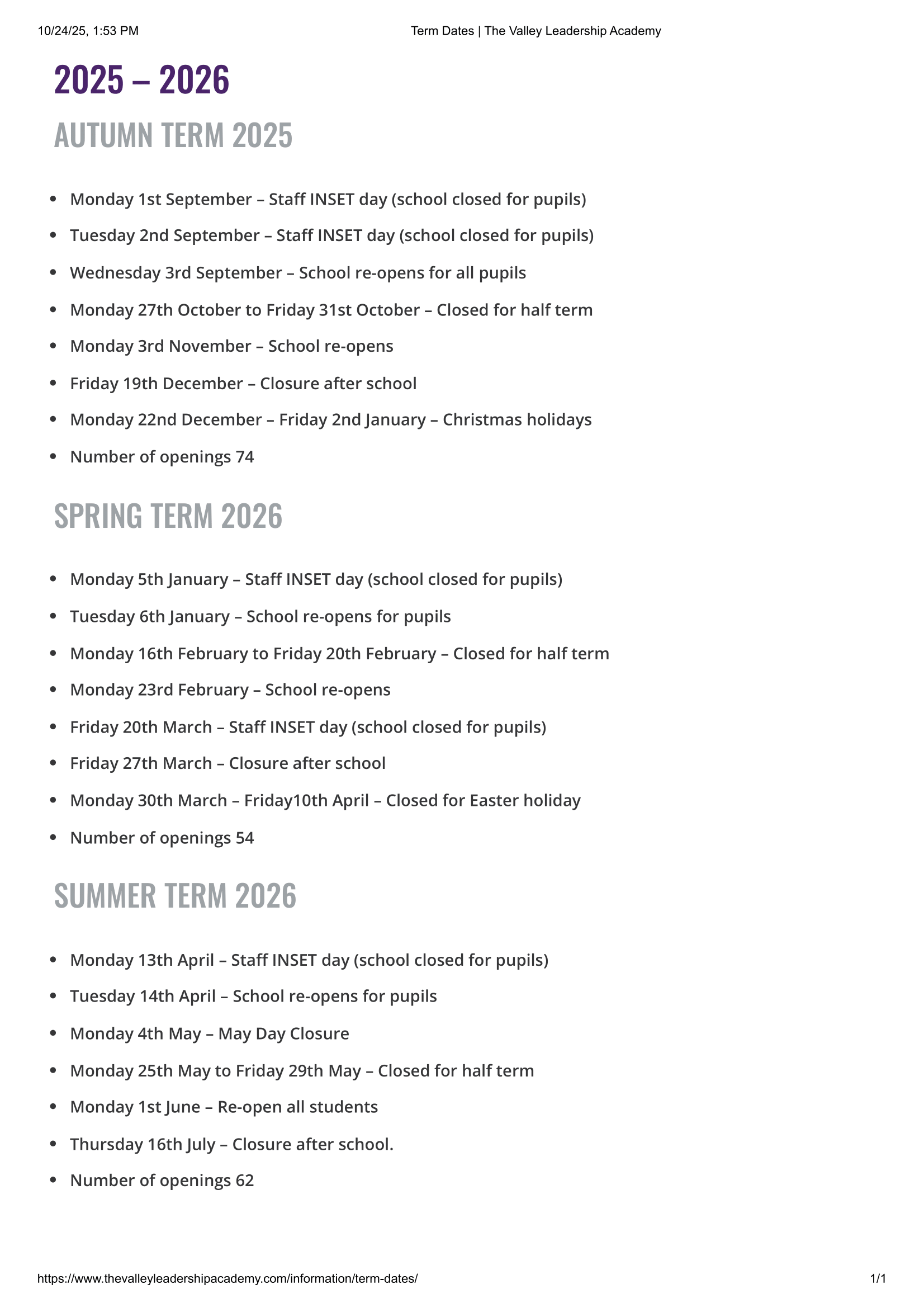 The school Term Dates shown on this page has been sourced directly from the official The Valley Leadership Academy website. Please be aware that all dates and events may be amended at the discretion of the school or local council. For the most up-to-date and accurate information, we recommend checking the official council website or contacting the school office.