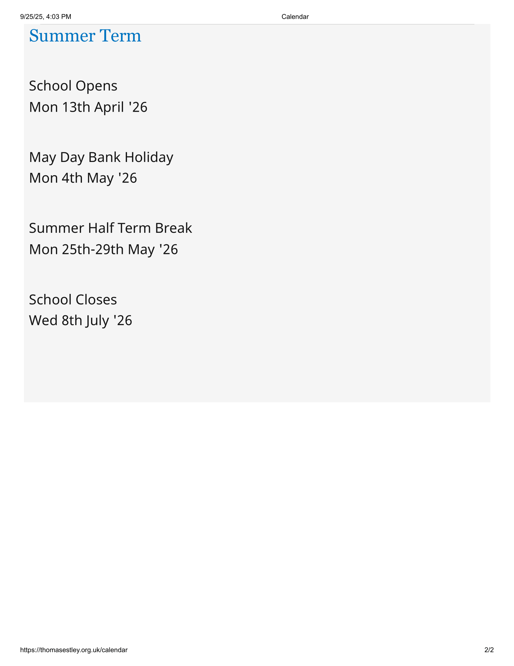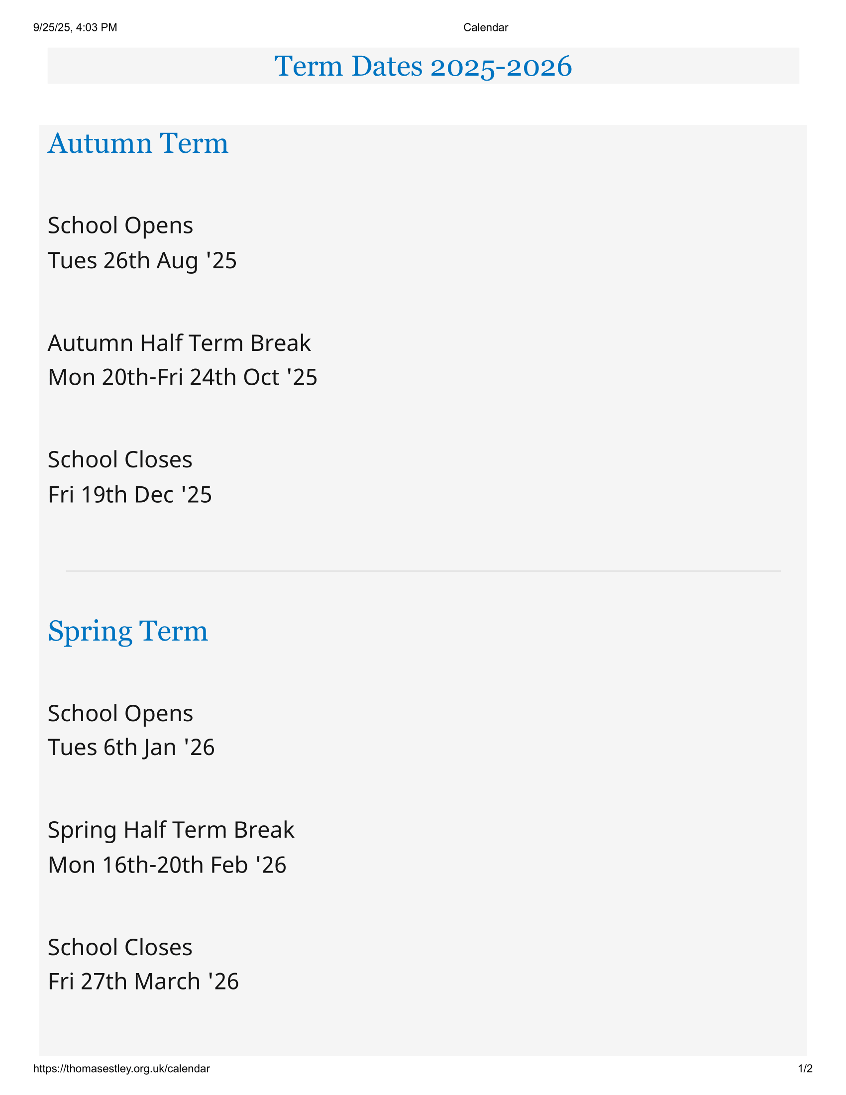 The school Term Dates shown on this page has been sourced directly from the official Thomas Estley Community term dates website. Please be aware that all dates and events may be amended at the discretion of the school or local council. For the most up-to-date and accurate information, we recommend checking the official council website or contacting the school office.