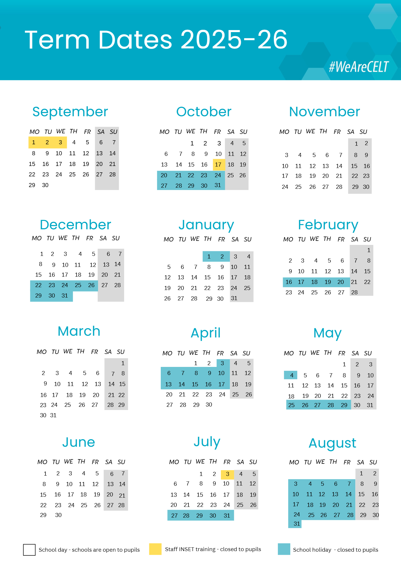 Please read: These dates are taken from the school’s published calendar for 2025–2026. Items reflect the legend categories (term dates, half terms, holidays, bank holidays, and inset days) exactly as shown on the calendar.