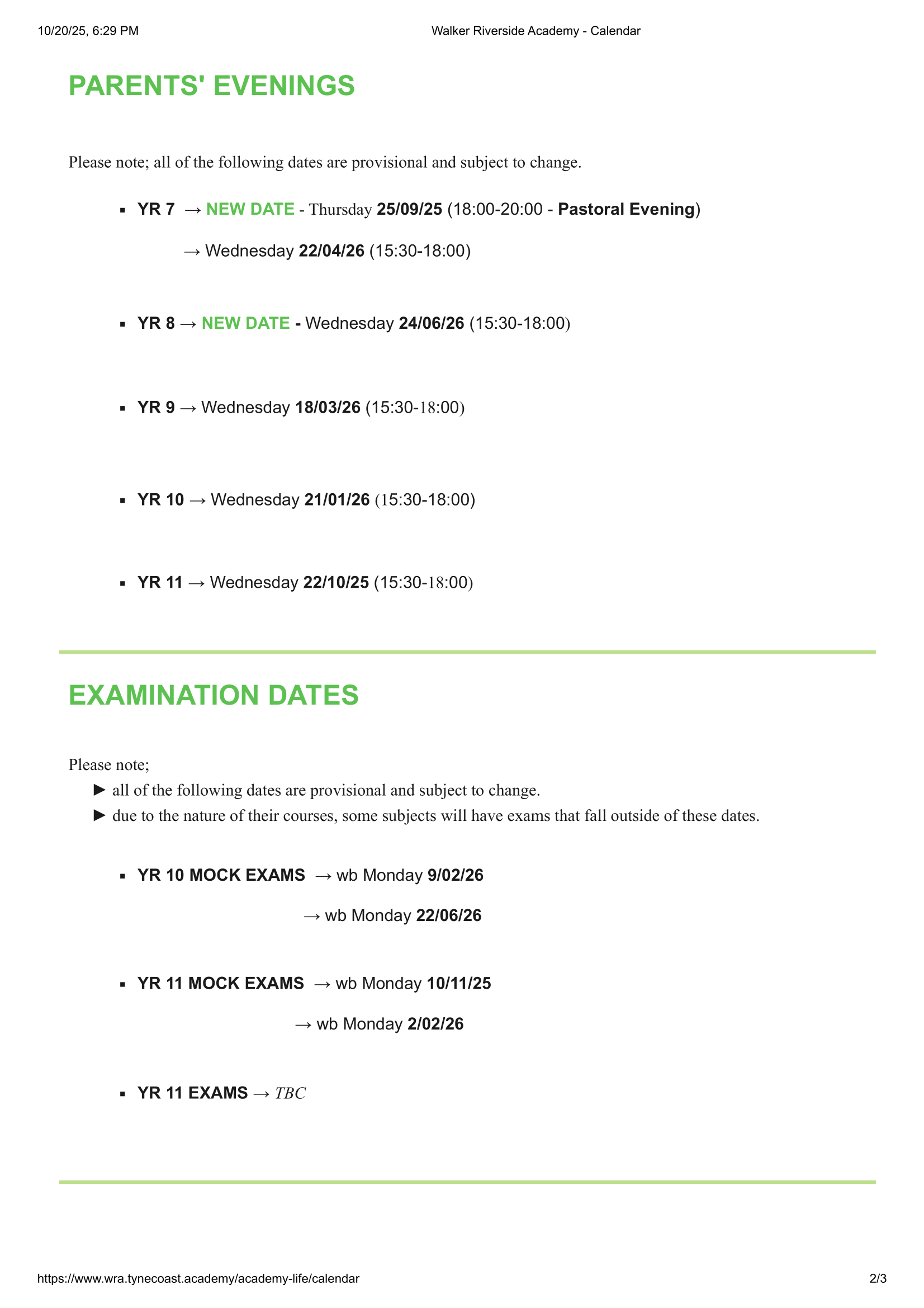 - Year 11 Mock Exams: wb Mon 10/11/2025 and wb Mon 2/02/2026