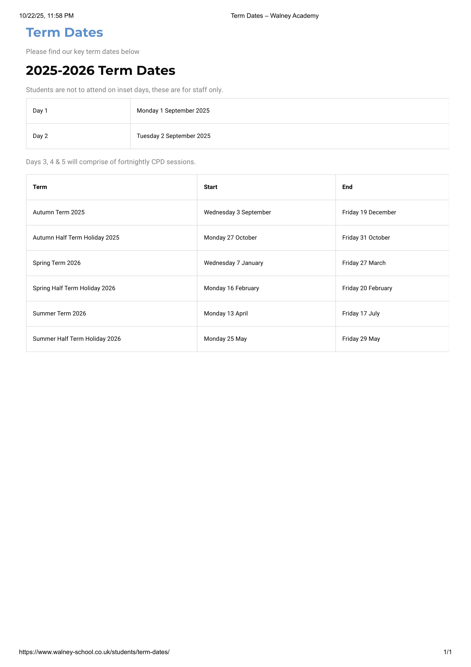 Walney Academy Term Dates 2025–2026
