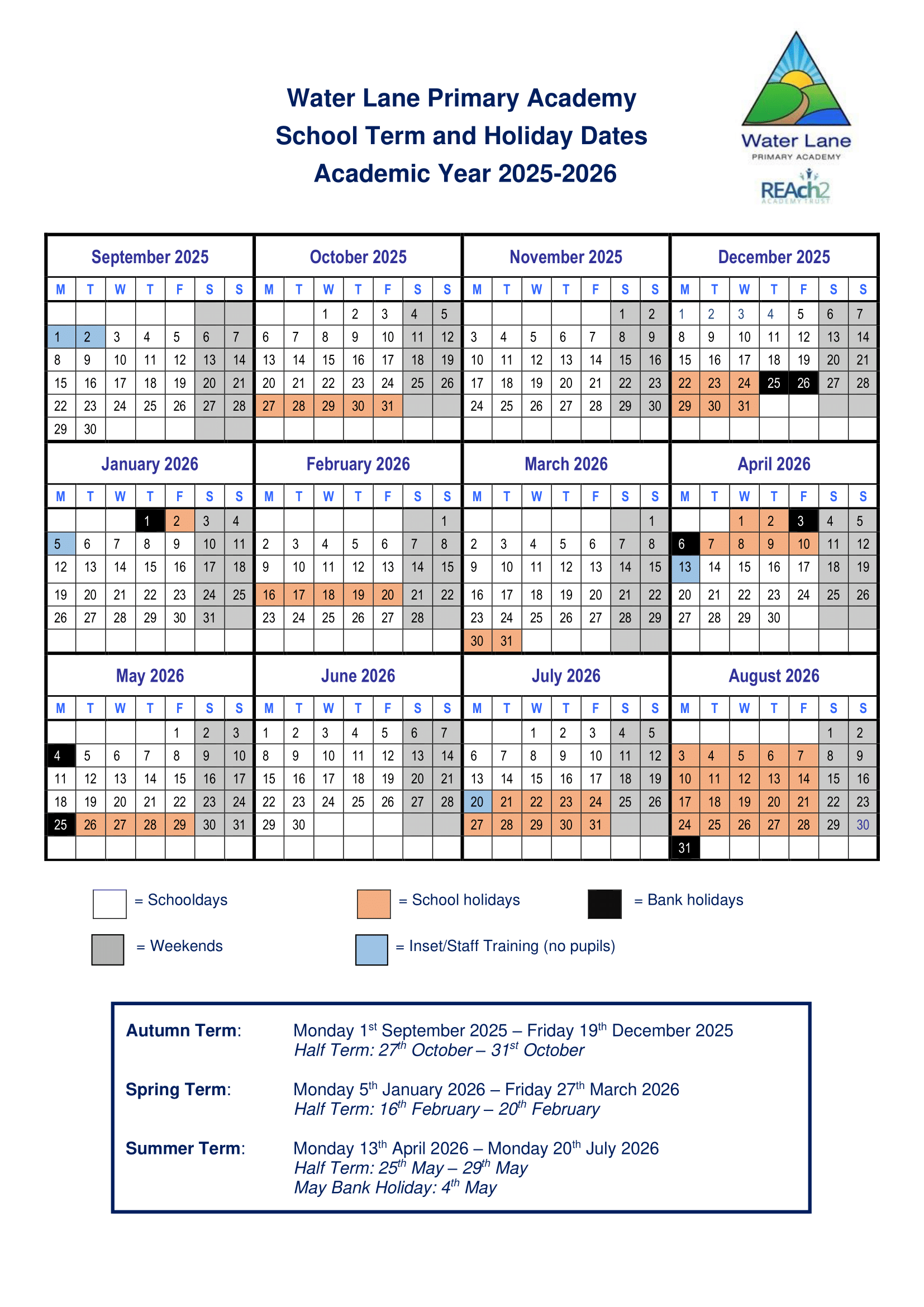 The school Term Dates shown on this page has been sourced directly from the official Water Lane Primary Academy term dates website. Please be aware that all dates and events may be amended at the discretion of the school or local council. For the most up-to-date and accurate information, we recommend checking the official council website or contacting the school office.