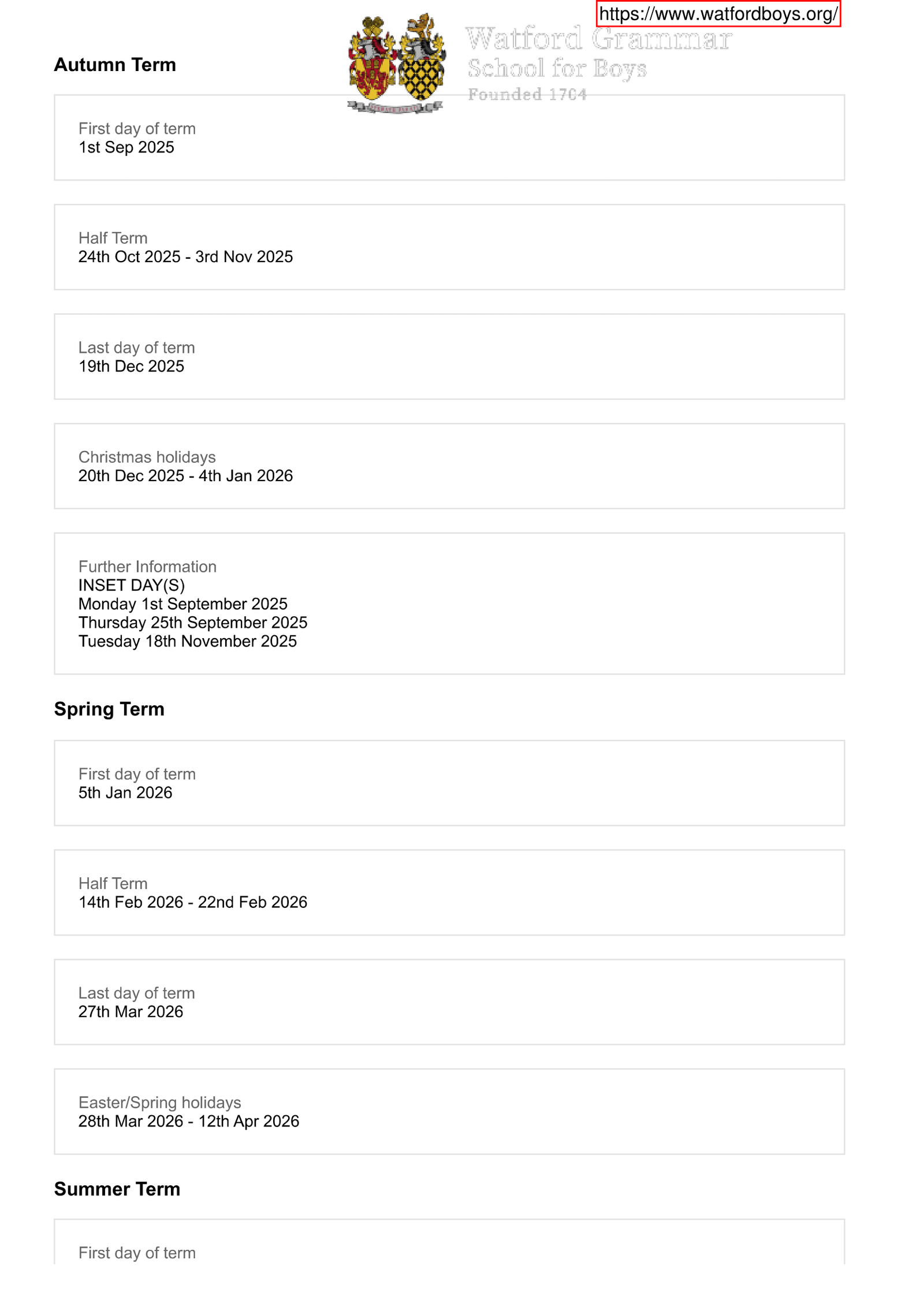 Watford Grammar School for Boys Term dates (2025-2026)