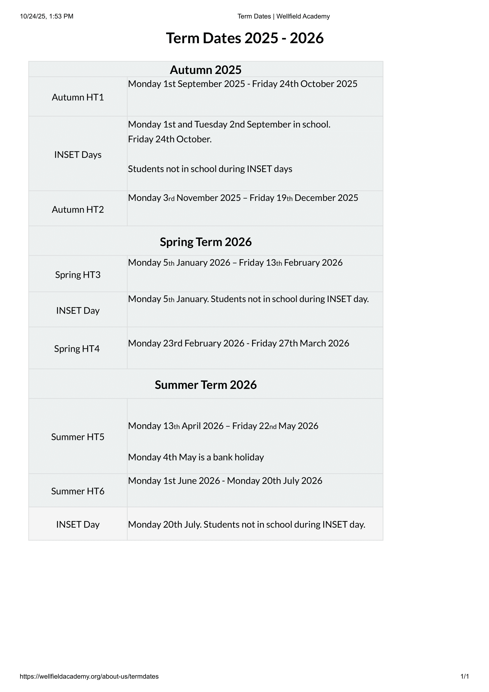 Wellfield Academy Term dates (2025-2026)
