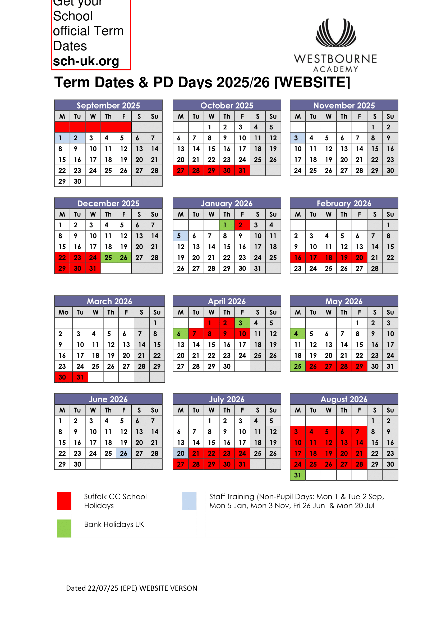 The school Term Dates shown on this page has been sourced directly from the official Westbourne Academy term dates website. Please be aware that all dates and events may be amended at the discretion of the school or local council. For the most up-to-date and accurate information, we recommend checking the official council website or contacting the school office.