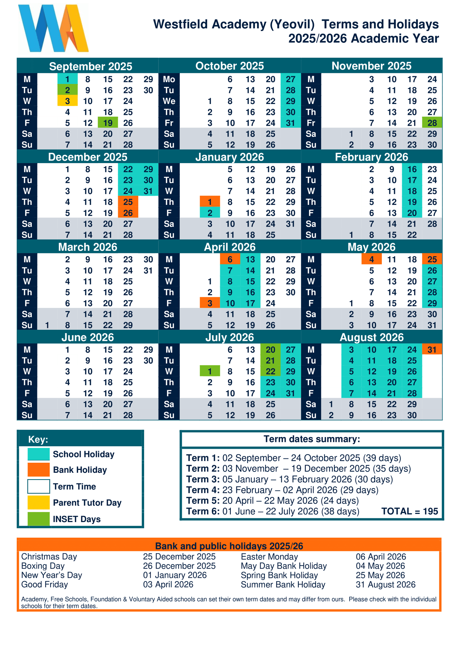 There are a total of 195 school days in the 2025–2026 academic year at Westfield Academy (Yeovil).