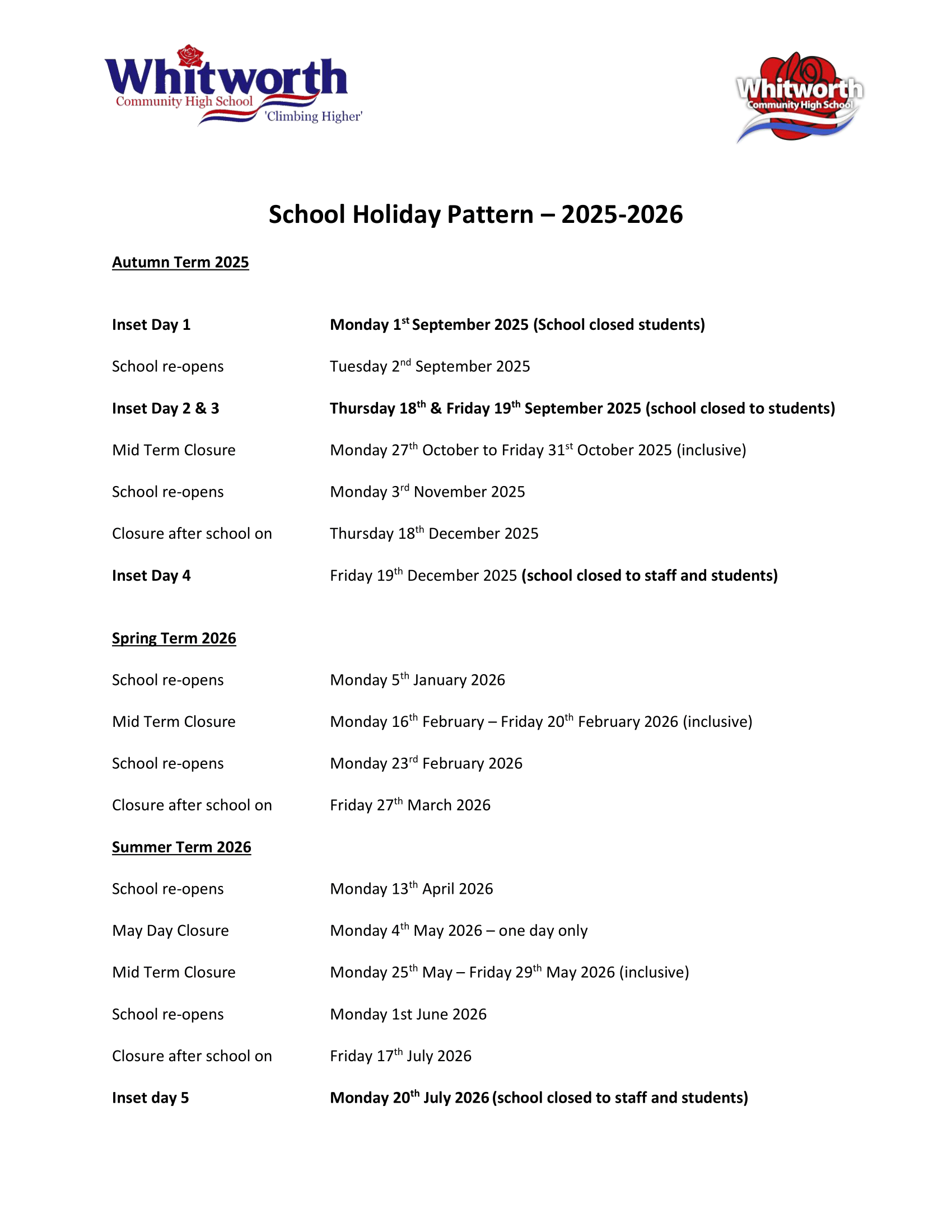 Whitworth Community High School Term Dates 2025–2026