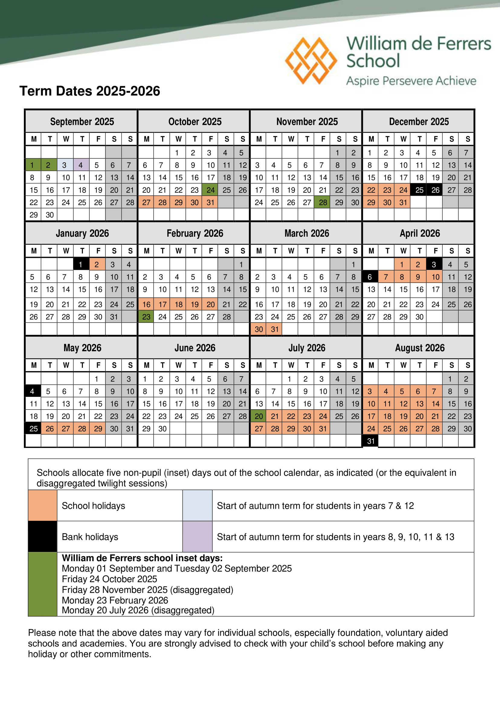 Please read: These dates are taken from the school’s published calendar for 2025–2026. Items reflect the legend categories (term dates, half terms, holidays, bank holidays, and inset days) exactly as shown on the calendar.